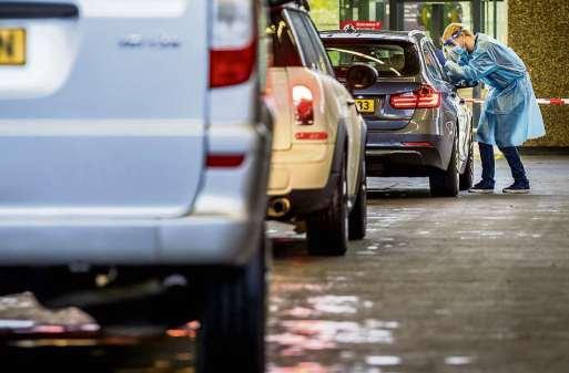 4. Auto’s staan in de rij bij een coronatestlocatie bij de RAI in Amsterdam. beeld ANP, Lex van Lieshout