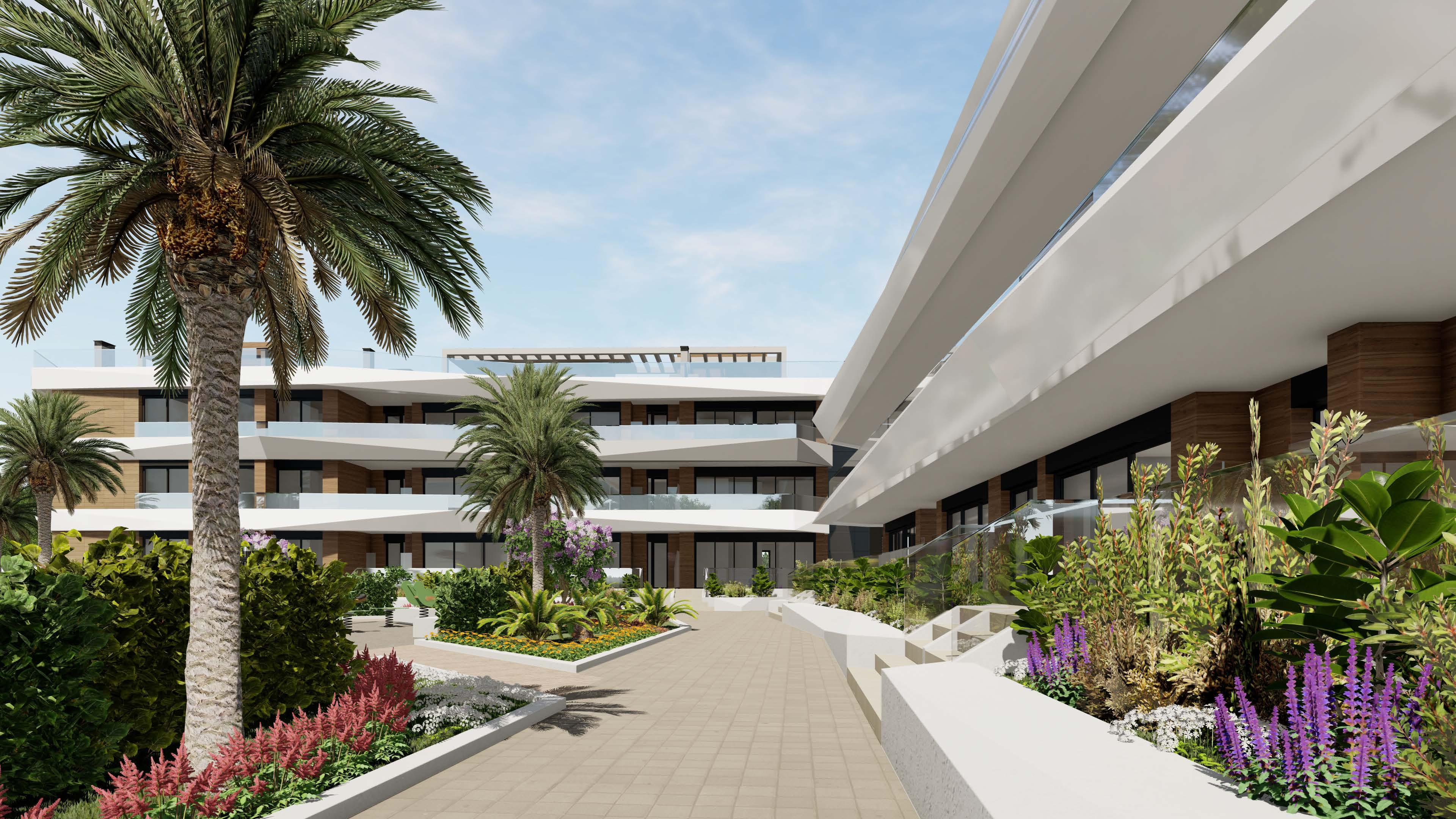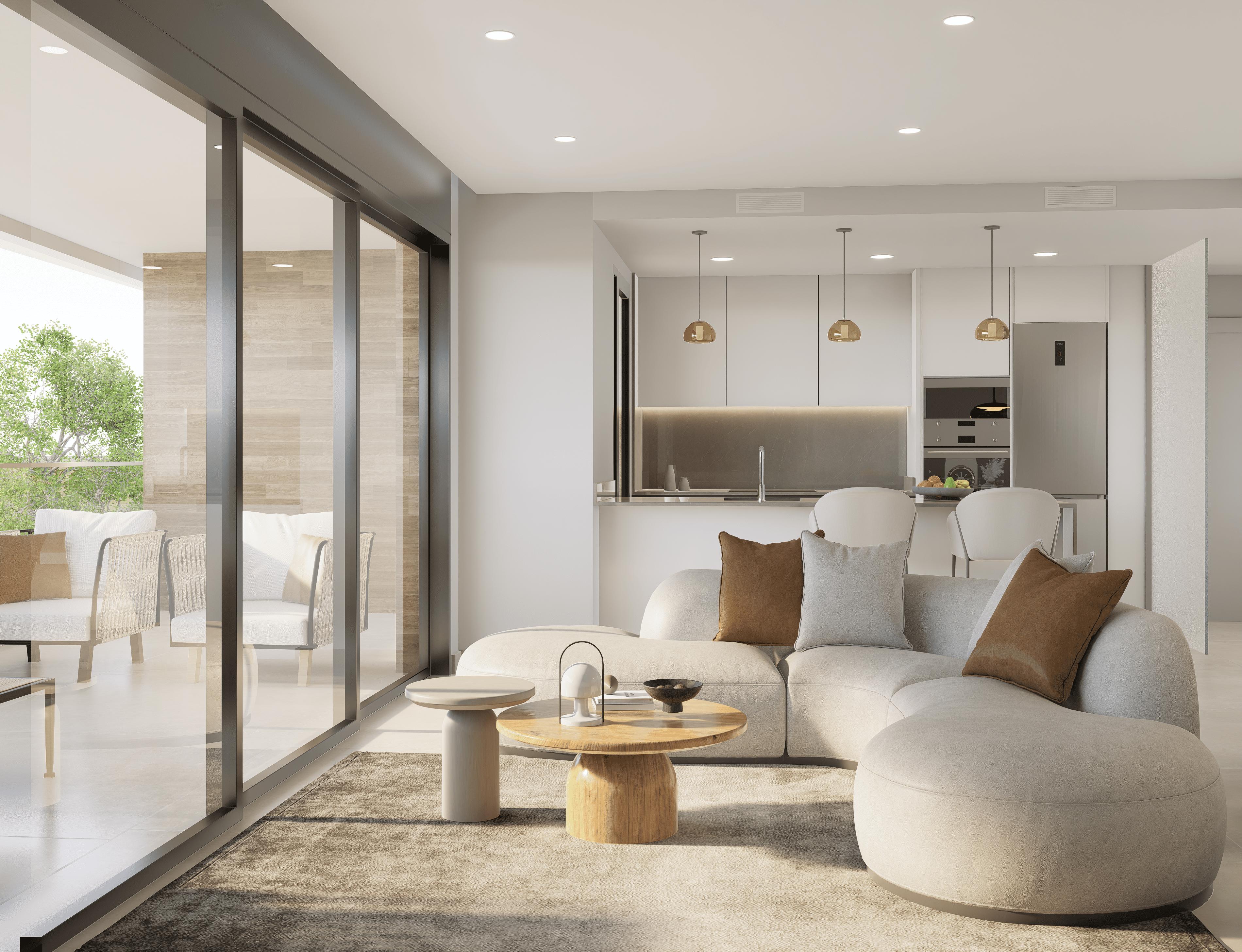 Modern 2 and 3-bedroom and bathroom apartments in Jávea Beach, a private residential complex next to Arenal Beach, featuring bright interiors, large terraces and communal areas with a swimming pool, gardens and relaxation spaces, designed both for year-round living and as a second home by the Mediterranean. The complex includes ground-floor options with private terraces and penthouses with solariums, ideal for those seeking more outdoor space and open views.