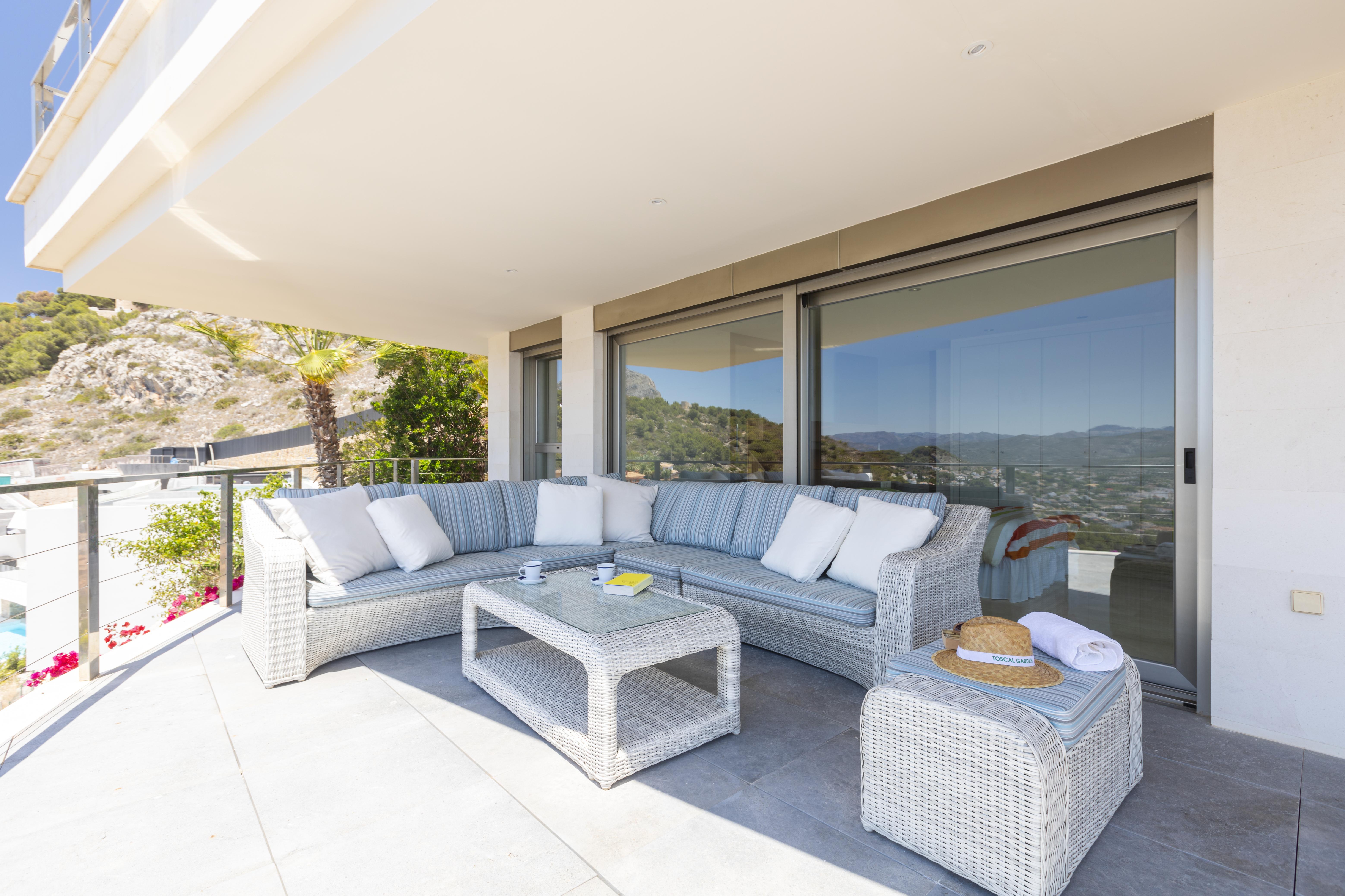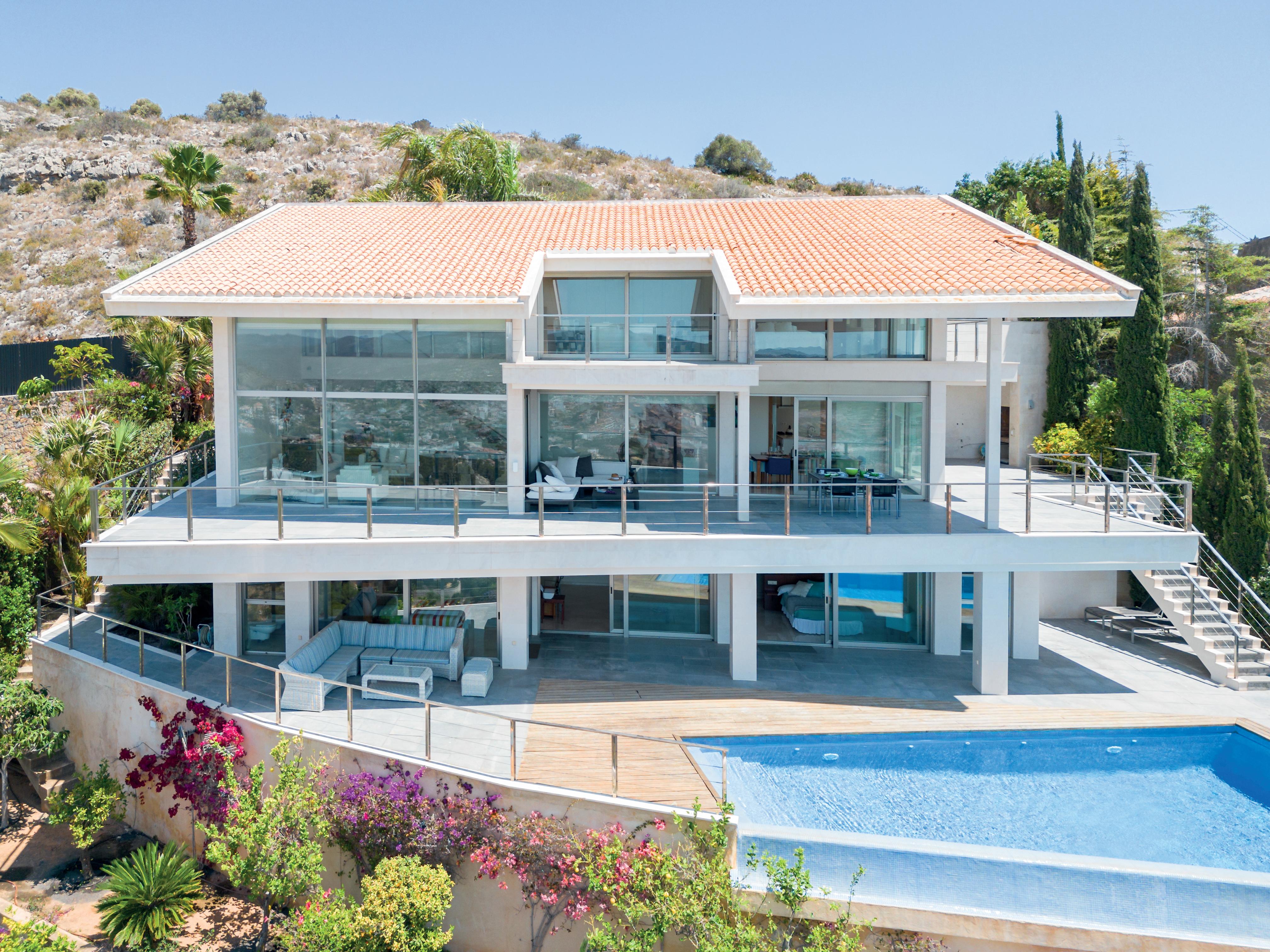 Modern and filled with natural light, this villa on the exclusive La Corona hillside enjoys spectacular panoramic views of the Mediterranean. Its contemporary architecture, defined by noble materials and expansive windows, opens every space seamlessly to the landscape. With generous terraces and an elegant design, it embodies Mediterranean luxury just minutes from the sea and the marina.