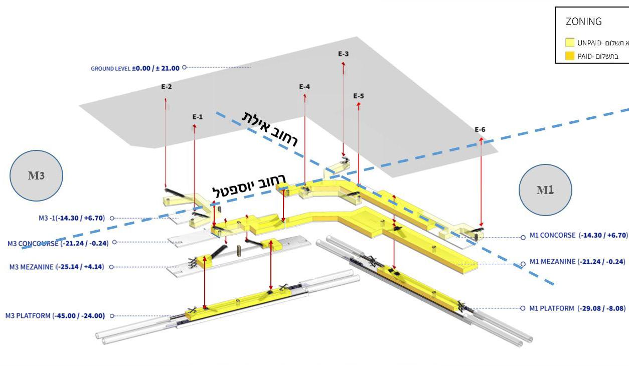 Holon Yoseftal is a complex station shared by the M1 and M3 metro lines. The combination of two metro lines and an Israel Railway station makes the station a significant transportation center.