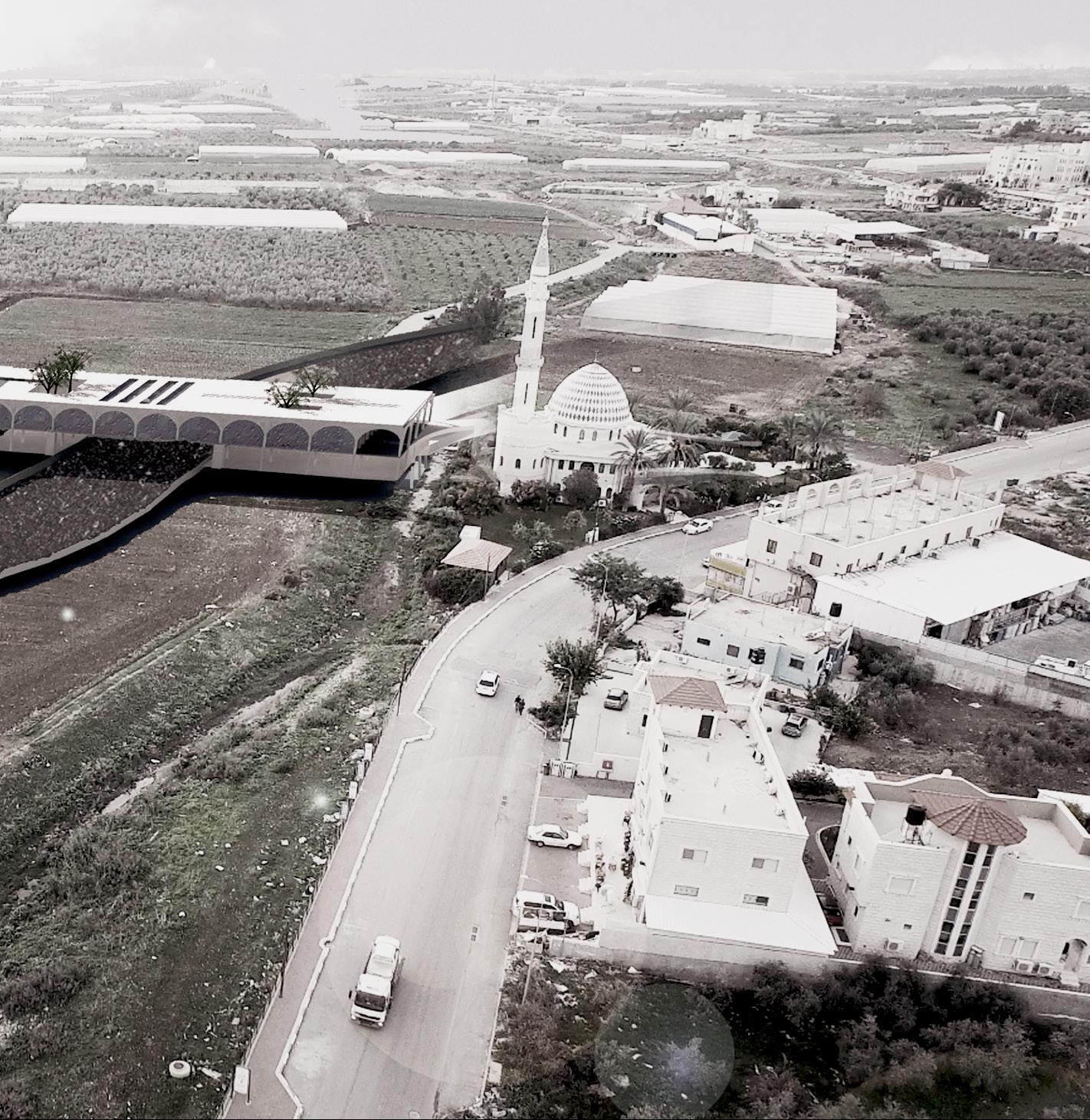 The built strip zoomed in on , lies on an axis that starts with a mosque in Baqa and ends with a school In jat. Therefore, this specific bridge building is set up as a commercial and communal building with an addition of offices. Being a linear built strip ,The concept of designing the building was also inspired by the place and the greenhouse grid, which was similar in length to the strip.