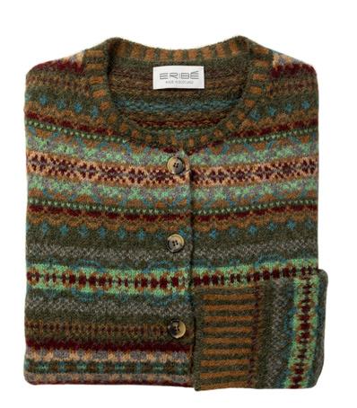 Cardigan version of our ultra soft Fairisle Kinross Sweater finished with horn buttons and traditional striped pattern detail on hem and cuff. Available for June 2025 delivery.