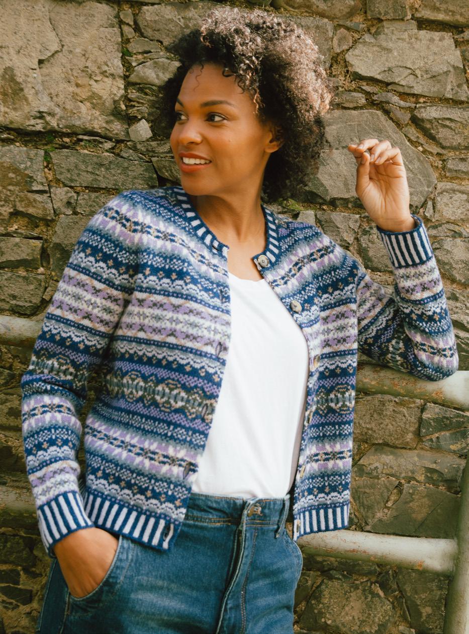 The short cardigan has Fairisle pattern detail on the shoulder and cuffs, hip length with long cuff and shell buttons. Designed to sit with high waisted trousers, skirts and dresses and suit a shorter body length.