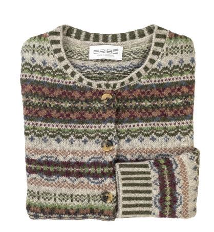 Over-hip length Fairisle cardigan with horn buttons, traditional striped pattern detail on hem and cuff. Knitted in 100% Shetland supersoft wool.