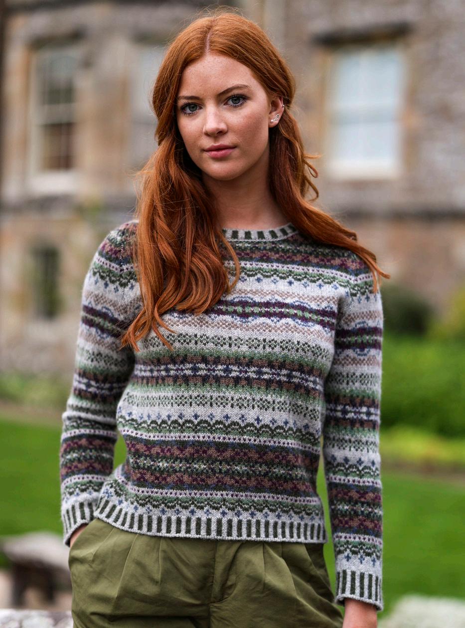 Fairisle pattern yoke sweater with pattern on hem and cuff, finished with a touch of luxury angora in the yoke to add indulgence and soft texture. Extra long cuffs to keep your hands warm and with a slightly shaped waist.