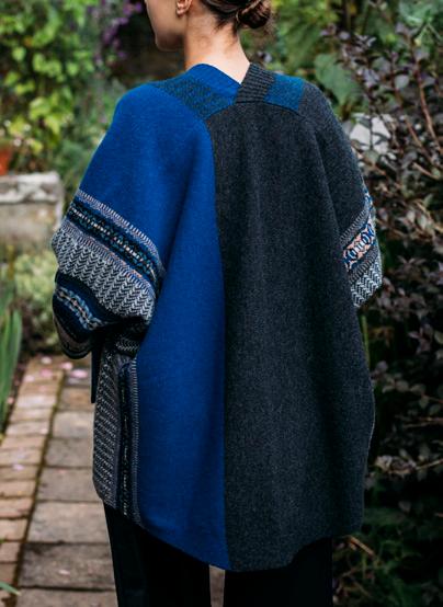 A versatile mid-thigh length coat, jacket or throw on, with practical deep pockets. Turn upside down for extra warmth around the shoulder or to wear elegantly as a shrug with a dress. This garment can be worn like a blanket, and is ideal for those temperature changing moments; a wonderful live-in garment for all occasions.