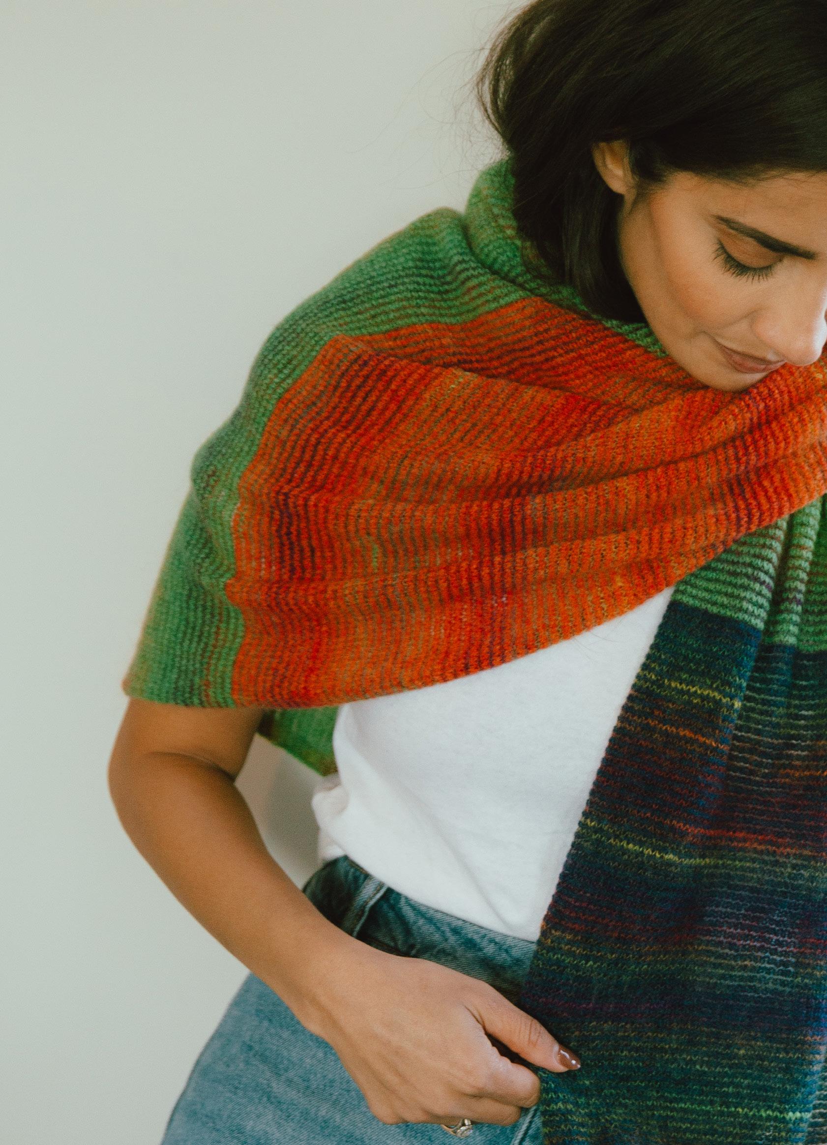 Beautifully soft and lightweight wrap giving volume in subtly changing colours and block stripes with a touch of luxury super-kid mohair.