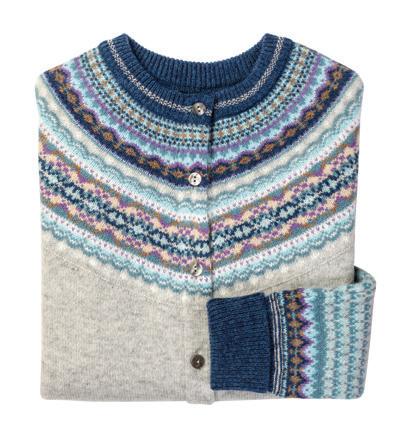 Fairisle pattern yoke cardigan with shell buttons, pattern on hem and cuff, finished with a touch of luxury angora in the yoke to add indulgence and soft texture. Extra long cuffs to keep your hands warm and with a slightly shaped waist.