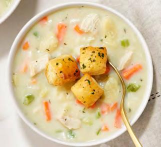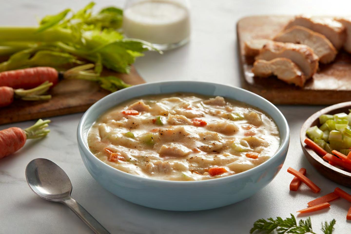 Our hearty Chicken & Dumpling Soup features flu y dumplings in a savory chicken broth brimming with tender white meat chicken and chunks of fresh celery and carrots.