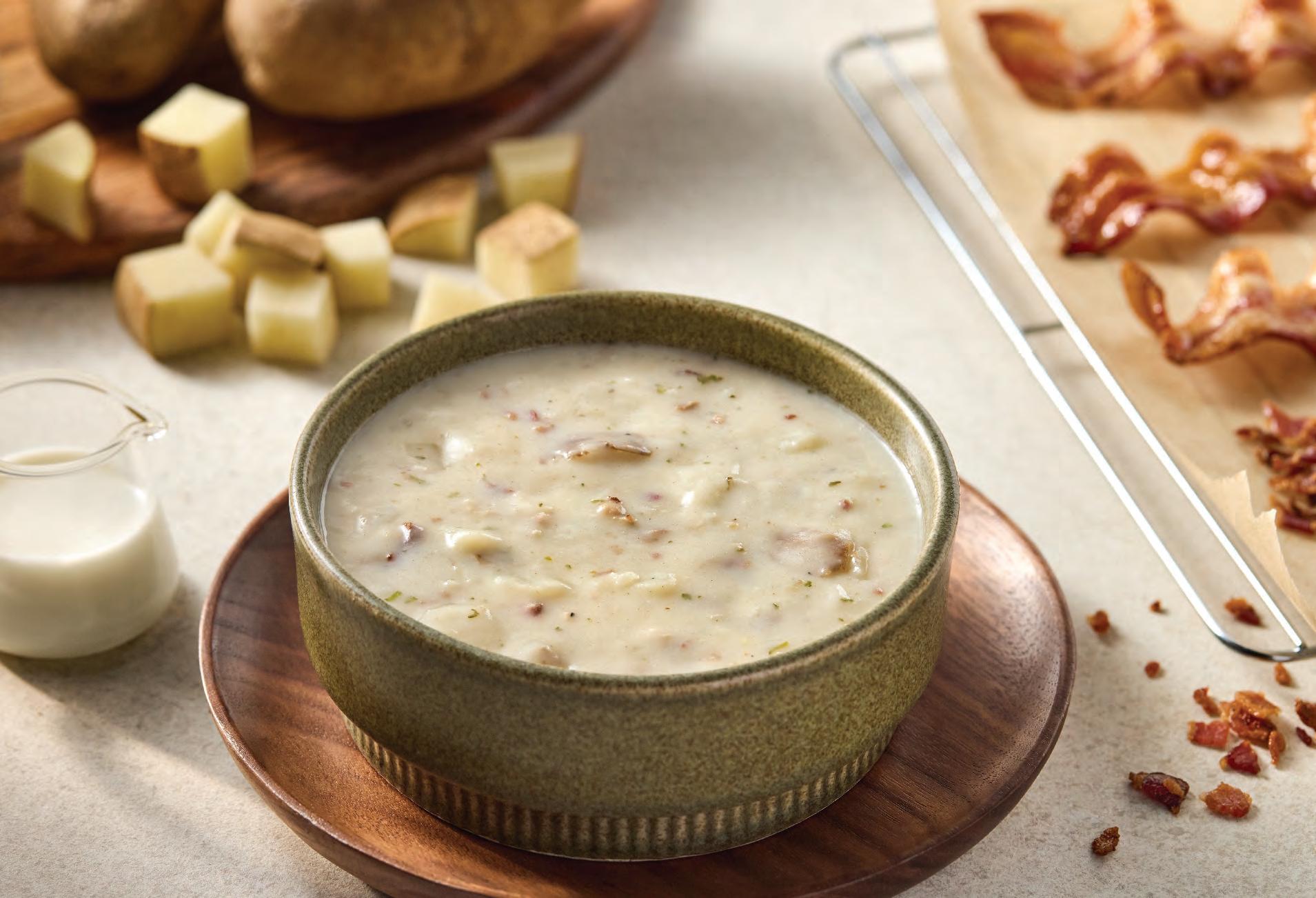 Warm up your menu with this creamy potato soup packed with chunks of potatoes, savory onions, and smoky bacon bits in a rich, velvety broth. It’s comfort food made easy!