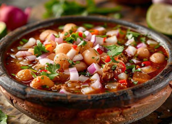 A vegetarian twist on Pozole, featuring smoky notes of chili pepper, hominy, cilantro, bell peppers, and a splash of lime