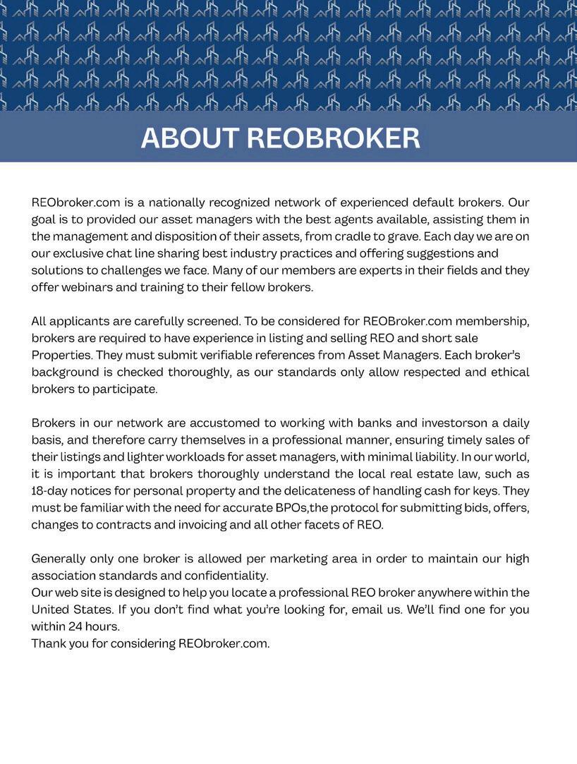 REObroker.com is an esteemed designation and valuable association. Many of our members have stayed with us consistently through several REO cycles, realizing the long-term benefits.