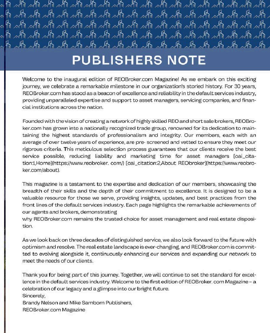Thank you for being part of our readership and for making this growing community a placewhereexpertiseissharedandopportunityiscreated.MaythisNovemberissue sharpen your insight and strengthen your strategy as you prepare to close the year with purpose—and step into 2026 ready to lead. Warmregards,TheEditorialTeam REOBroker.com Clarity.Insight.Opportunity