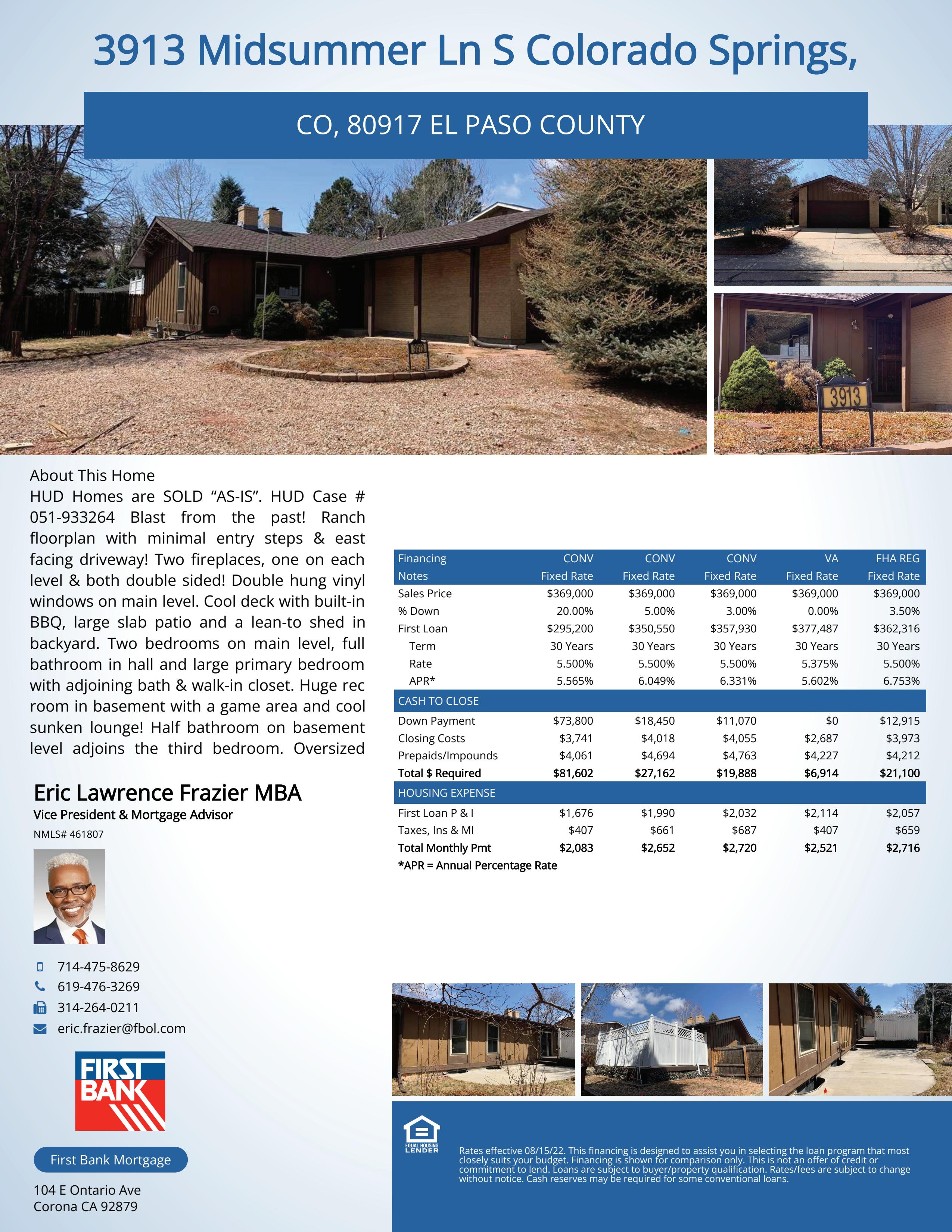 BEDROOMS BATHROOMS SQ. FT PROPERTY ADDRESS 3 2 1,290 265 1st St Soledad, Monterey County OFFER PRICE: $500,000 PROPERTY GALLERY SINGLE FAMILY HOME YEAR BUILT: 1966 TOTAL ROOMS: 6 for more information about this property or to make an offer to purchase please contact a VIP Agent by clicking here https://www.thepowerisnow.com/vipagent/ or call 800-261-1634 ext 707 ERIC L. FRAZIER NMLS ID: 461807 PHONE: (800) 261-1634 EXT: 703 EMAIL: ERIC.FRAZIER@THEPOWERISNOW.COM PROPERTY CASE NO: 042-792175
