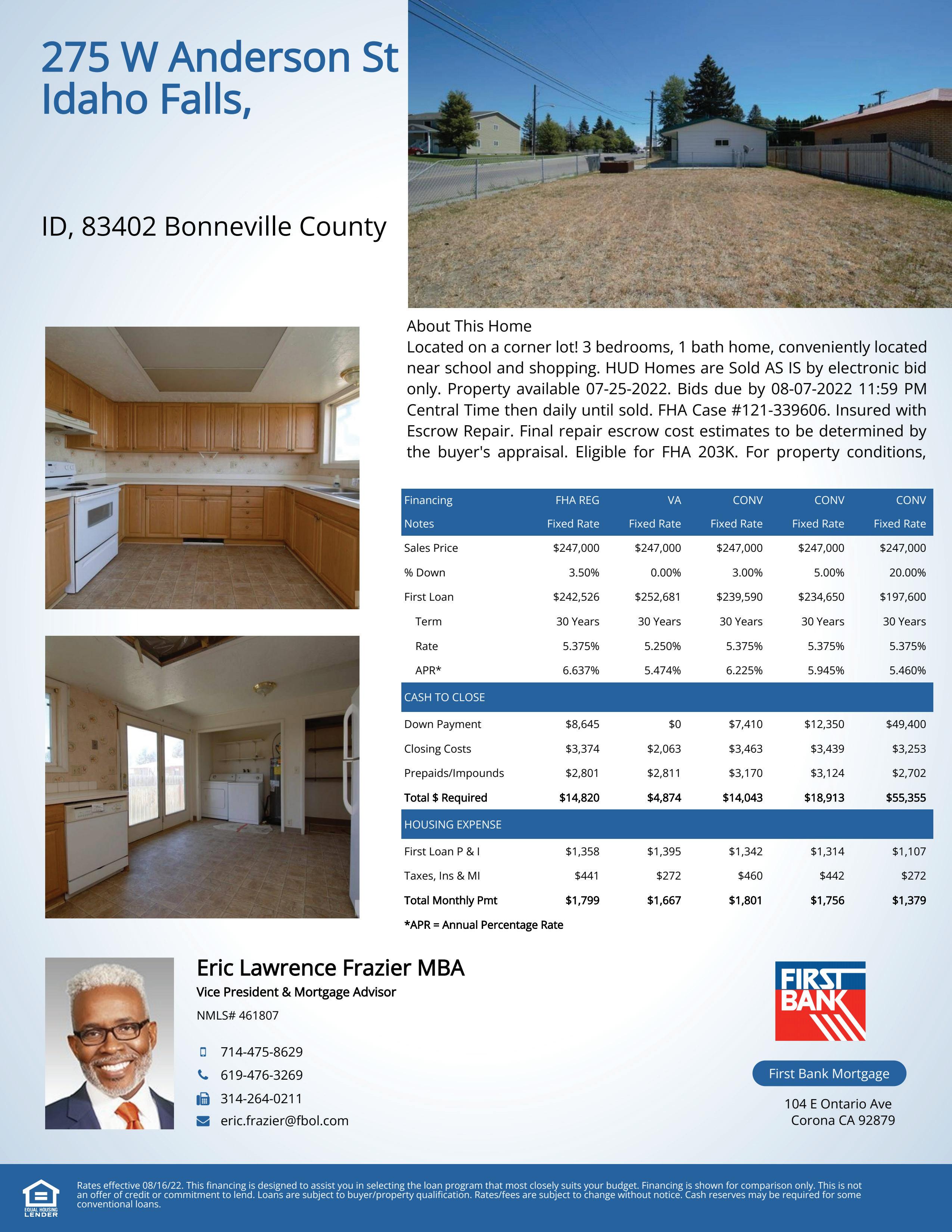 BEDROOMS BATHROOMS SQ. FT PROPERTY ADDRESS 4 2 1,502 2119 N 9th Ave Pasco, Franklin County OFFER PRICE: $295,000 PROPERTY GALLERY single family home YEAR BUILT: 1957 TOTAL ROOMS: 9 for more information about this property or to make an offer to purchase please contact a VIP Agent by clicking here: https://www.thepowerisnow.com/vipagent/ or call 800-261-1634 ext 707 ERIC L. FRAZIER NMLS ID: 461807 PHONE: (800) 261-1634 EXT: 703 EMAIL: ERIC.FRAZIER@THEPOWERISNOW.COM PROPERTY CASE NO: 562-288378