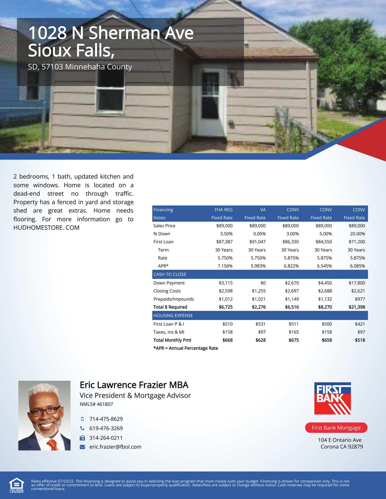 BEDROOMS BATHROOMS SQ. FT PROPERTY ADDRESS 2 1 660 1028 N Sherman Ave Sioux Falls, Minnehaha County OFFER PRICE: $89,000 PROPERTY GALLERY single family home YEAR BUILT: 1939 TOTAL ROOMS: 4 for more information about this property or to make an offer to purchase please contact a VIP Agent by clicking here: https://www.thepowerisnow.com/vipagent/ or call 800-261-1634 ext 707 ERIC L. FRAZIER NMLS ID: 461807 PHONE: (800) 261-1634 EXT: 703 EMAIL: ERIC.FRAZIER@THEPOWERISNOW.COM PROPERTY CASE NO: 471-145804