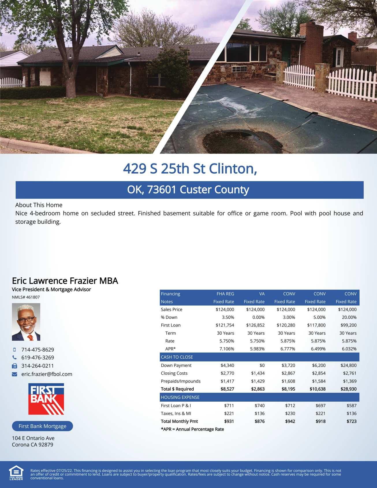 BEDROOMS BATHROOMS SQ. FT PROPERTY ADDRESS 4 2 2,378 429 S 25th St Clinton, Custer County OFFER PRICE: $171,000 PROPERTY GALLERY single family home YEAR BUILT: 1960 TOTAL ROOMS: 7 for more information about this property or to make an offer to purchase please contact a VIP Agent by clicking here: https://www.thepowerisnow.com/vipagent/ or call 800-261-1634 ext 707 ERIC L. FRAZIER NMLS ID: 461807 PHONE: (800) 261-1634 EXT: 703 EMAIL: ERIC.FRAZIER@THEPOWERISNOW.COM PROPERTY CASE NO: 421-549676