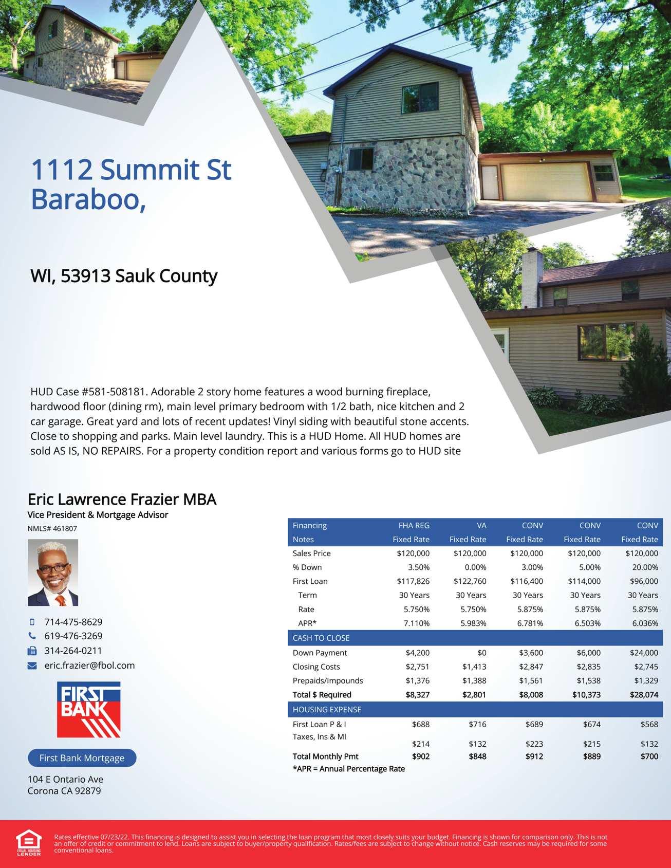 BEDROOMS BATHROOMS SQ. FT PROPERTY ADDRESS 4 1 1,704 1112 Summit St Baraboo, 53913 Sauk County OFFER PRICE: $120,000 PROPERTY GALLERY SINGLE FAMILY HOME YEAR BUILT: 1901 TOTAL ROOMS: 7 for more information about this property or to make an offer to purchase please contact a VIP Agent by clicking here: https://www.thepowerisnow.com/vipagent/ or call 800-261-1634 ext 707 ERIC L. FRAZIER NMLS ID: 461807 PHONE: (800) 261-1634 EXT: 703 EMAIL: ERIC.FRAZIER@THEPOWERISNOW.COM PROPERTY CASE NO: 581-508181