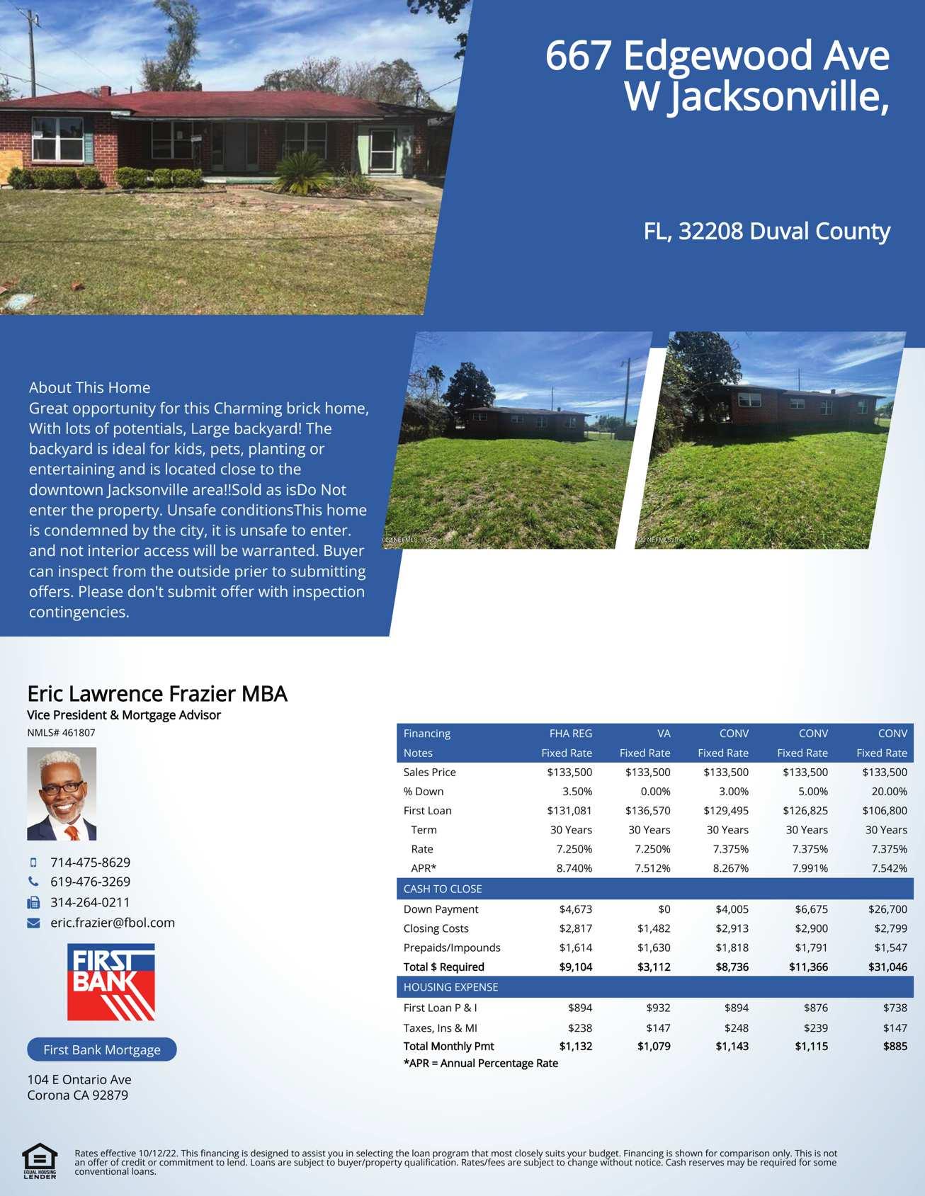 BEDROOMS BATHROOMS SQ. FT PROPERTY ADDRESS 3 2 1,290 265 1st St Soledad, Monterey County OFFER PRICE: $500,000 PROPERTY GALLERY SINGLE FAMILY HOME YEAR BUILT: 1966 TOTAL ROOMS: 6 for more information about this property or to make an offer to purchase please contact a VIP Agent by clicking here https://www.thepowerisnow.com/vipagent/ or call 800-261-1634 ext 707 ERIC L. FRAZIER NMLS ID: 461807 PHONE: (800) 261-1634 EXT: 703 EMAIL: ERIC.FRAZIER@THEPOWERISNOW.COM PROPERTY CASE NO: 042-792175