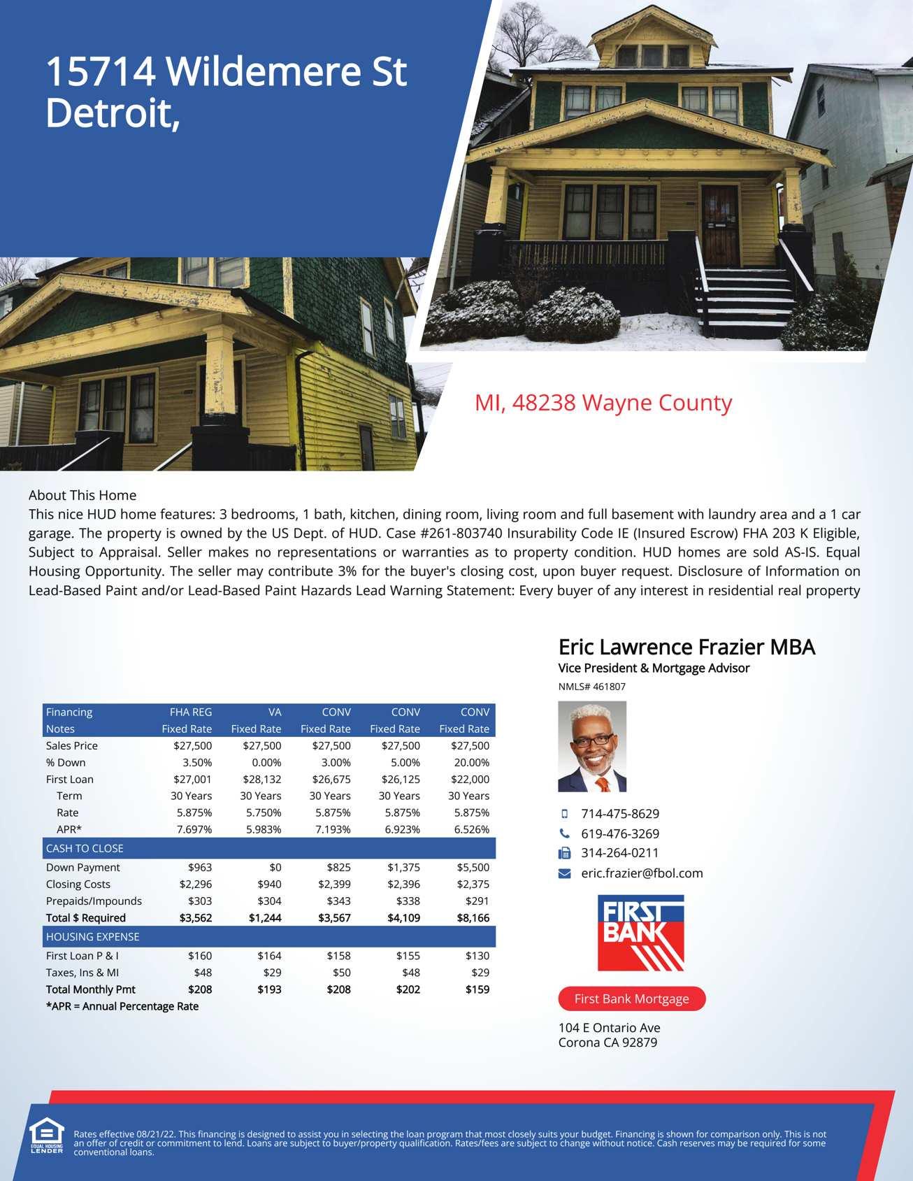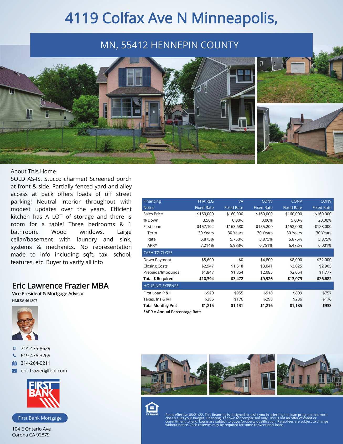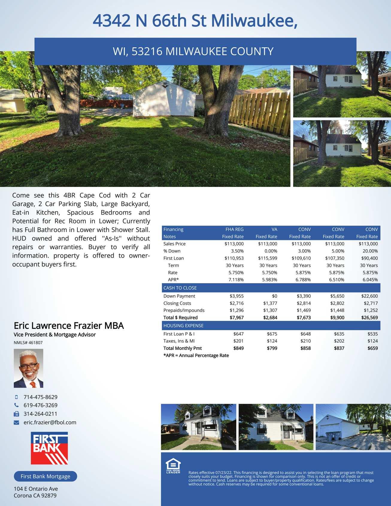 BEDROOMS BATHROOMS SQ. FT PROPERTY ADDRESS 4 1 1,131 4342 N 66th St Milwaukee, Milwaukee County OFFER PRICE: $113,000 PROPERTY GALLERY SINGLE FAMILY HOME YEAR BUILT: 1953 TOTAL ROOMS: 6 for more information about this property or to make an offer to purchase please contact a VIP Agent by clicking here: https://www.thepowerisnow.com/vipagent/ or call 800-261-1634 ext 707 ERIC L. FRAZIER NMLS ID: 461807 PHONE: (800) 261-1634 EXT: 703 EMAIL: ERIC.FRAZIER@THEPOWERISNOW.COM PROPERTY CASE NO: 581-337658