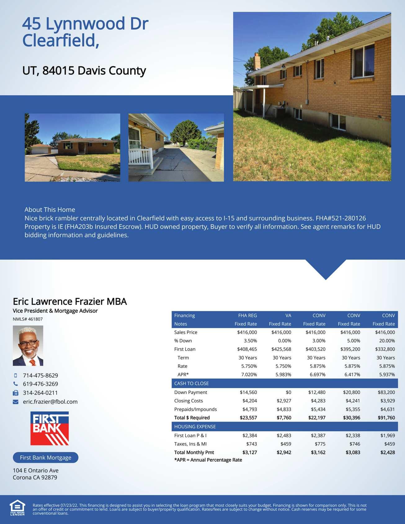 BEDROOMS BATHROOMS SQ. FT PROPERTY ADDRESS 3 2 1,404 45 Lynnwood Dr Clearfield, Davis County OFFER PRICE: $416,000 PROPERTY GALLERY single family home YEAR BUILT: 1959 TOTAL ROOMS: 5 for more information about this property or to make an offer to purchase please contact a VIP Agent by clicking here: https://www.thepowerisnow.com/vipagent/ or call 800-261-1634 ext 707 ERIC L. FRAZIER NMLS ID: 461807 PHONE: (800) 261-1634 EXT: 703 EMAIL: ERIC.FRAZIER@THEPOWERISNOW.COM PROPERTY CASE NO: 521-280126