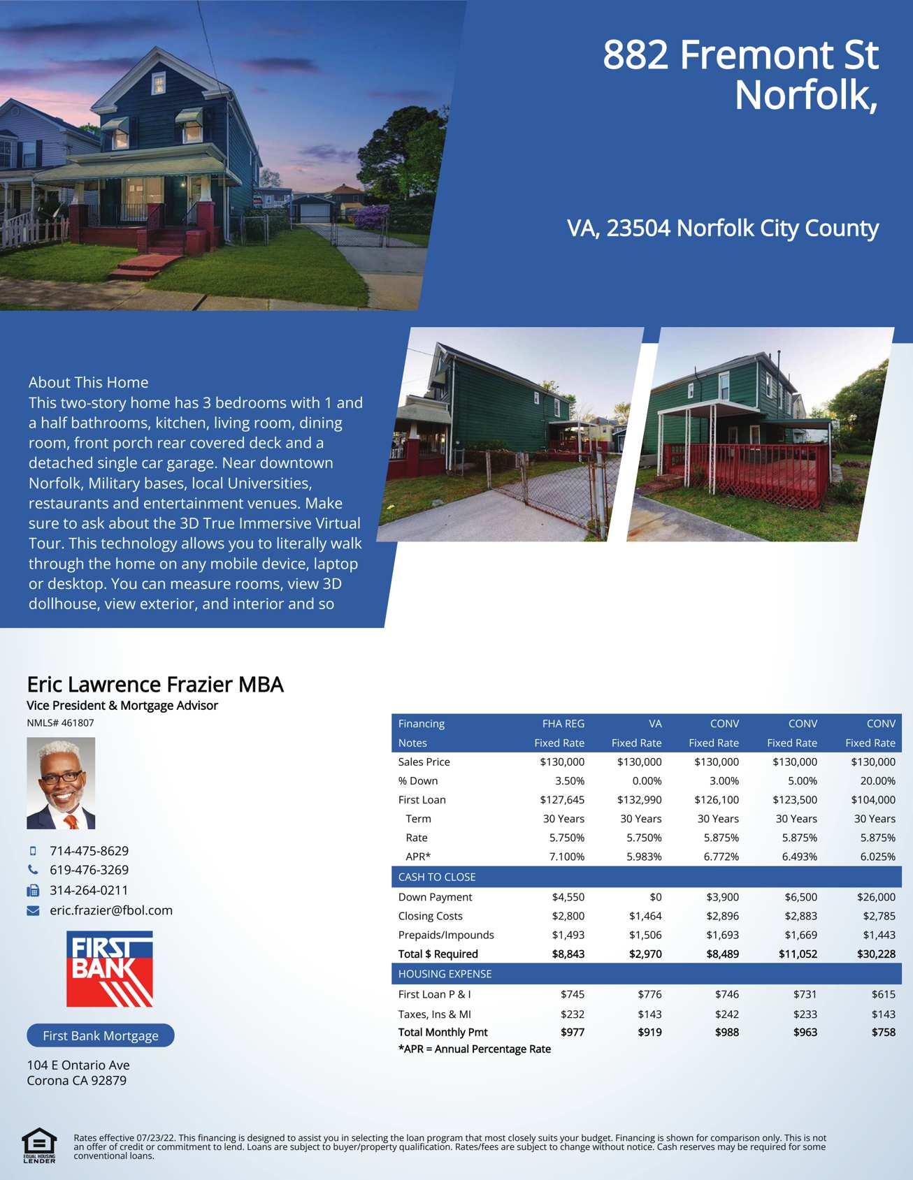 BEDROOMS BATHROOMS SQ. FT PROPERTY ADDRESS 2 1 1,445 882 Fremont St Norfolk, Norfolk City County OFFER PRICE: $130,000 PROPERTY GALLERY single family home YEAR BUILT: 1910 TOTAL ROOMS: 5 for more information about this property or to make an offer to purchase please contact a VIP Agent by clicking here: https://www.thepowerisnow.com/vipagent/ or call 800-261-1634 ext 707 ERIC L. FRAZIER NMLS ID: 461807 PHONE: (800) 261-1634 EXT: 703 EMAIL: ERIC.FRAZIER@THEPOWERISNOW.COM PROPERTY CASE NO: 541-925070