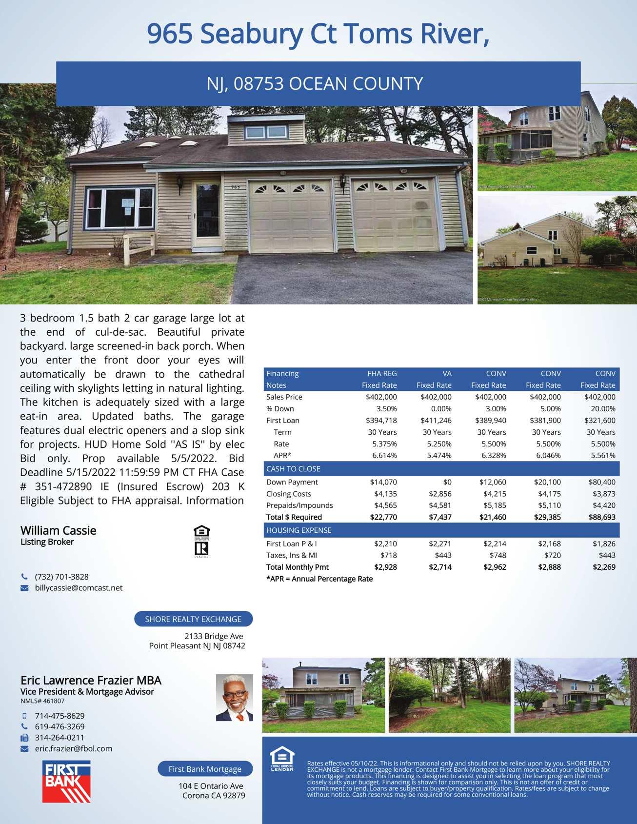 v bedrooms SingleFamilyHome Contactlistingbroker Ericl.frazier NMLSID:461807 Phone:(800)261-1634ext.703 eric.frazier@thepowerisnow.comWilliamCassie (732)701-3828 Yearbuilt:1987 Propertygallery Propertycasen0:351-472890 Offerprice:$402,000 3 1 1,641 Propertyaddress 965SeaburyCtTomsRiver,Ocean County bathroomsSquarefeet