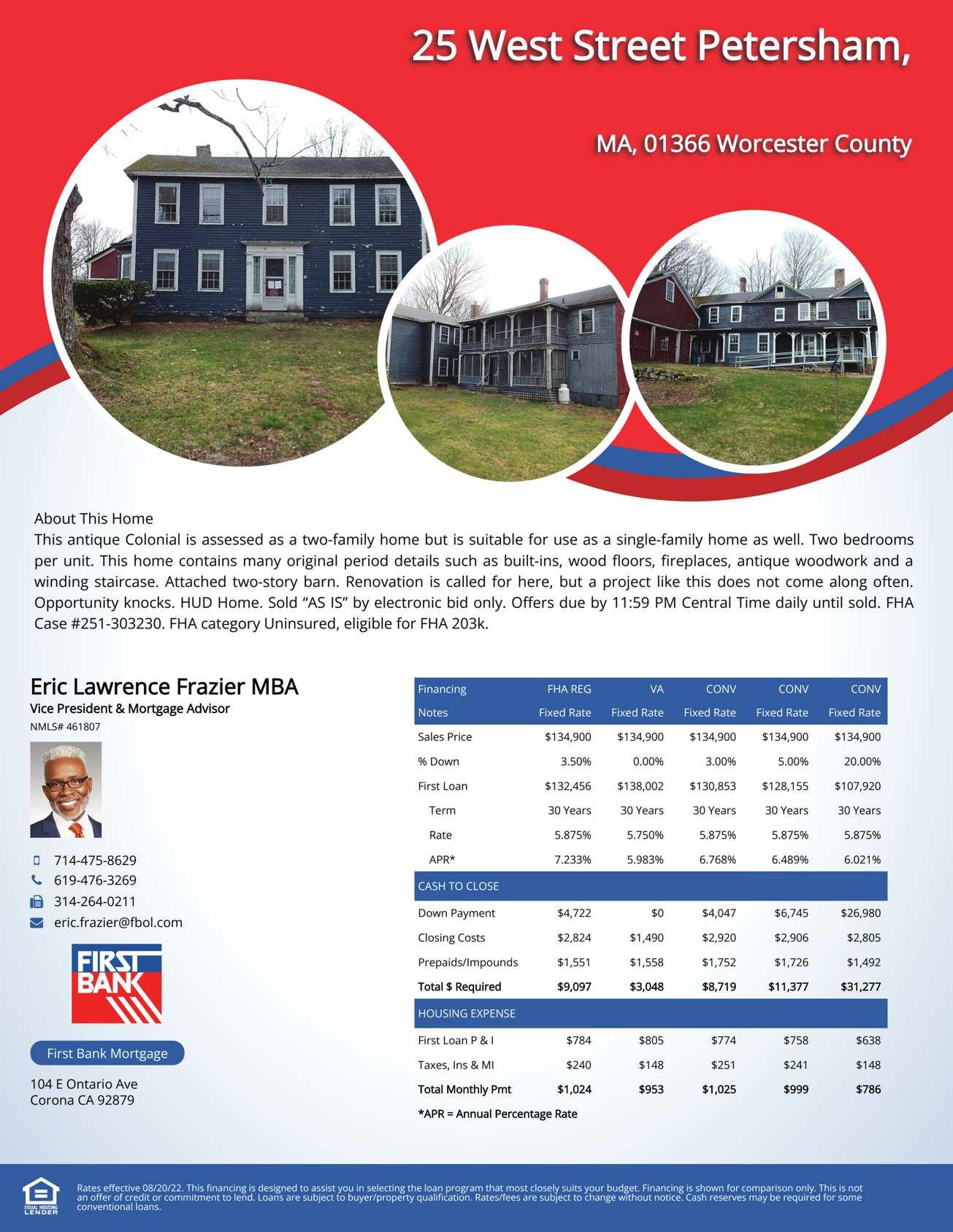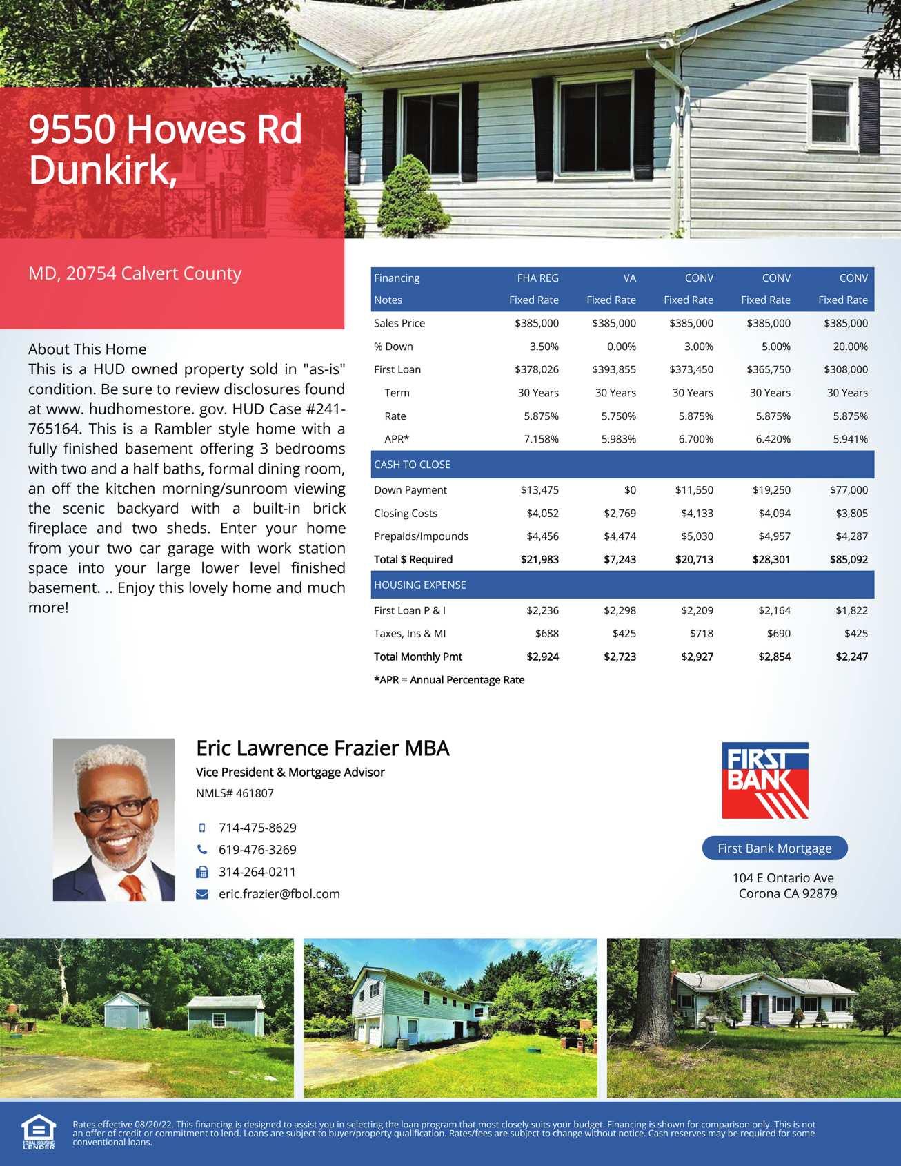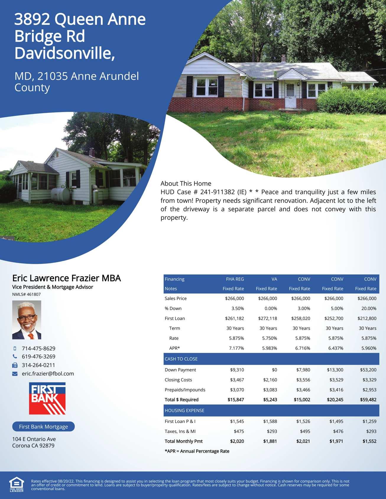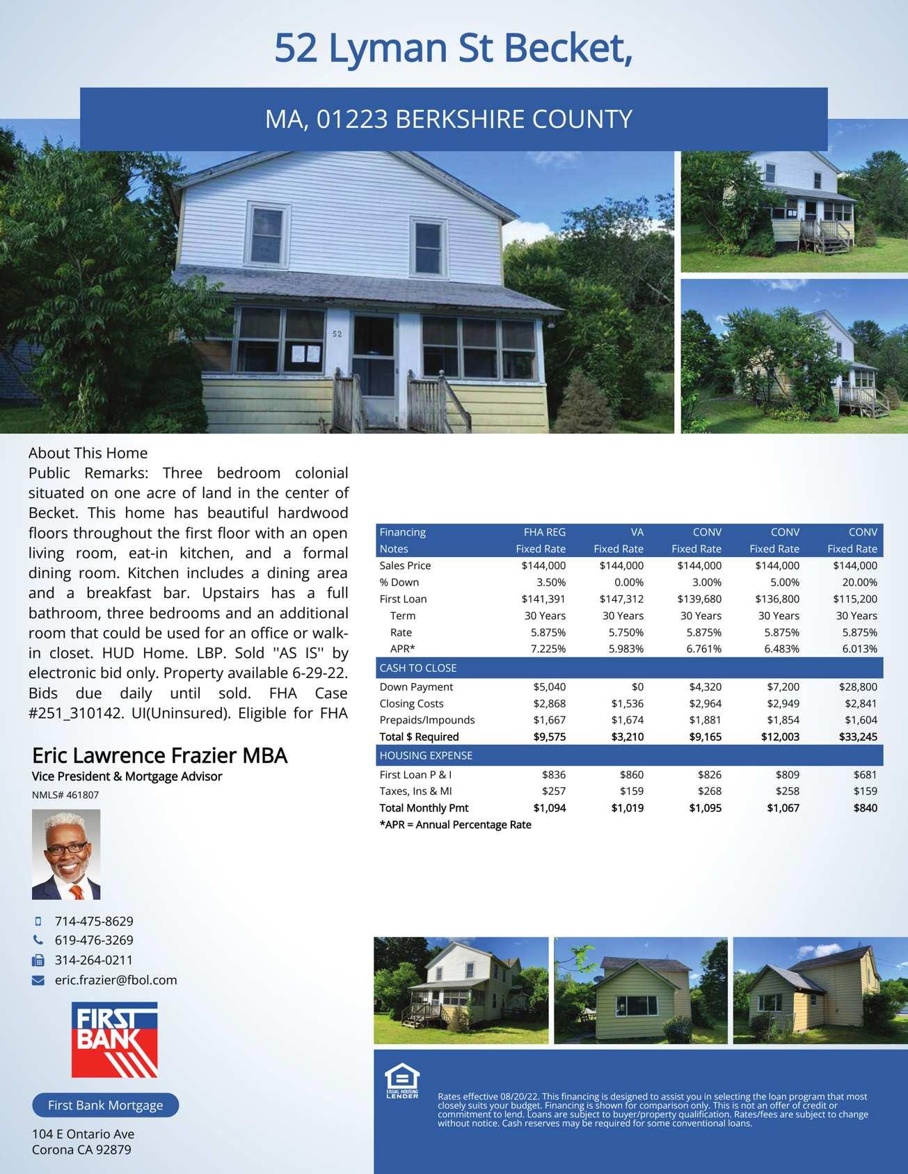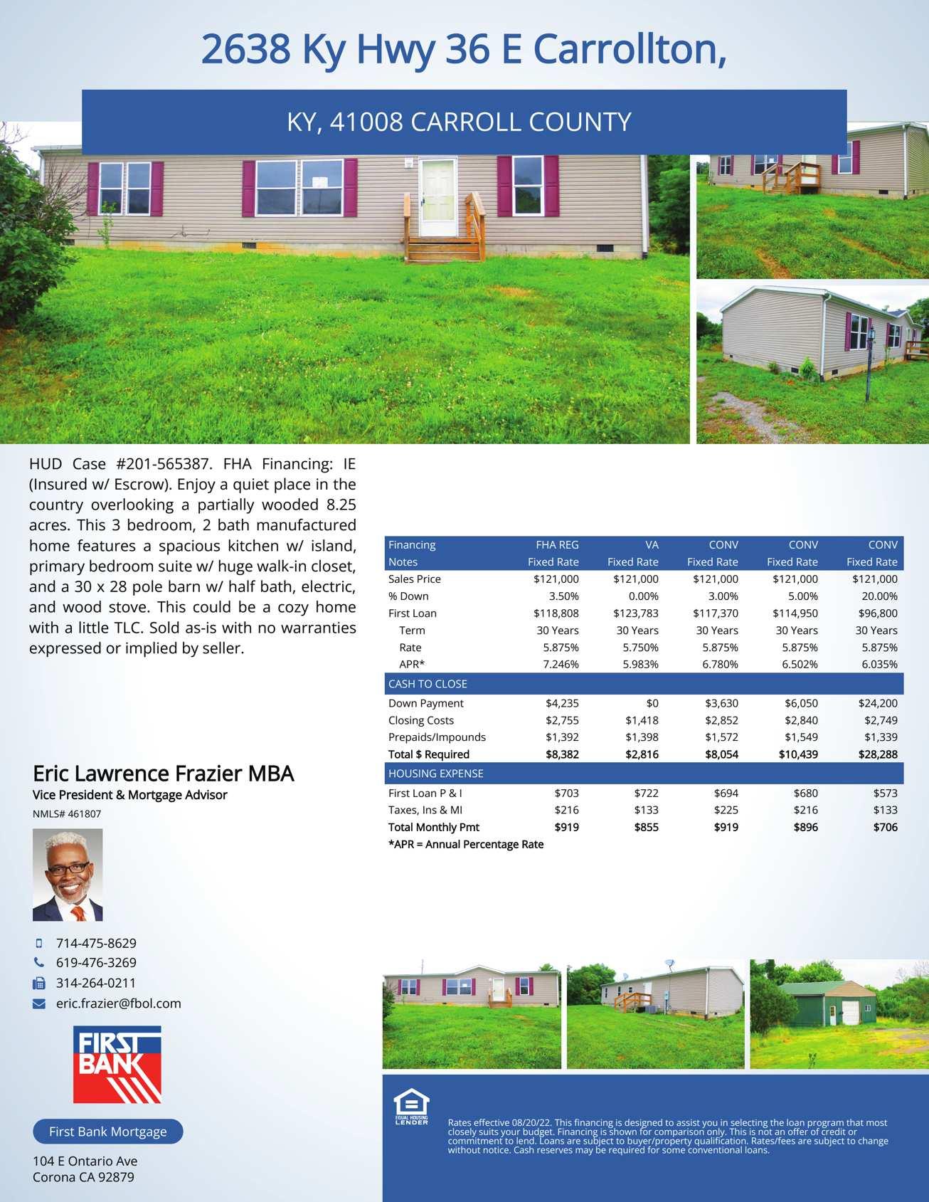 BEDROOMS BATHROOMS SQ. FT PROPERTY ADDRESS 4 1 1,858 548 County Route 18 Harrietstown, Franklin County OFFER PRICE: $160,000 PROPERTY GALLERY manufactured home YEAR BUILT: 1880 TOTAL ROOMS: 7 for more information about this property or to make an offer to purchase please contact a VIP Agent by clicking here: https://www.thepowerisnow.com/vipagent/ or call 800-261-1634 ext 707 ERIC L. FRAZIER NMLS ID: 461807 PHONE: (800) 261-1634 EXT: 703 EMAIL: ERIC.FRAZIER@THEPOWERISNOW.COM PROPERTY CASE NO: 371-384119