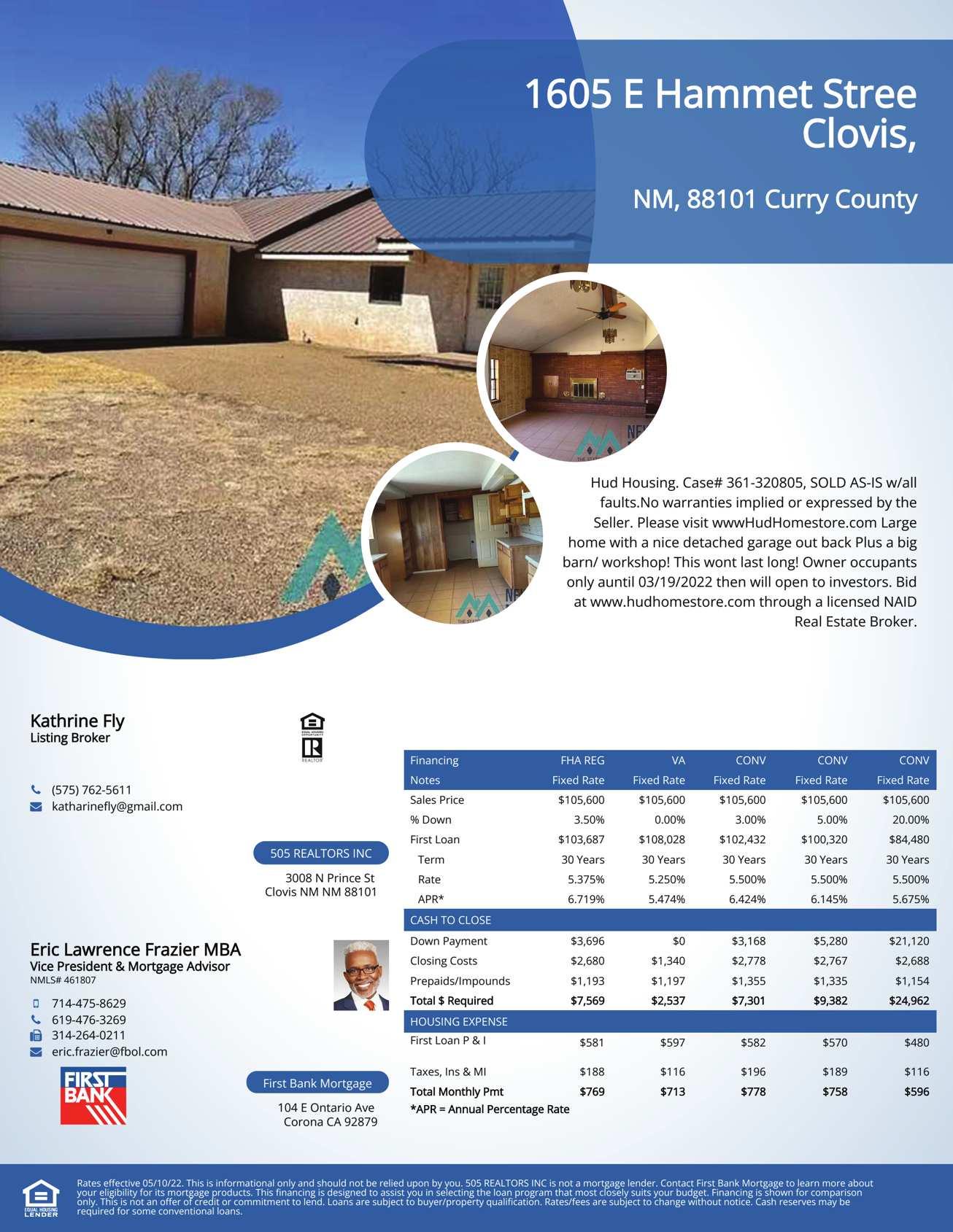v bedrooms SingleFamilyHome Contactlistingbroker Ericl.frazier NMLSID:461807 Phone:(800)261-1634ext.703 eric.frazier@thepowerisnow.com KatharineFly (575)762-5611 Yearbuilt:1965 Propertygallery Propertycasen0:361-320805 Offerprice:$105,600 3 2 1,776 Propertyaddress 1605EHammetStreetClovis, CurryCounty bathroomsSquarefeet