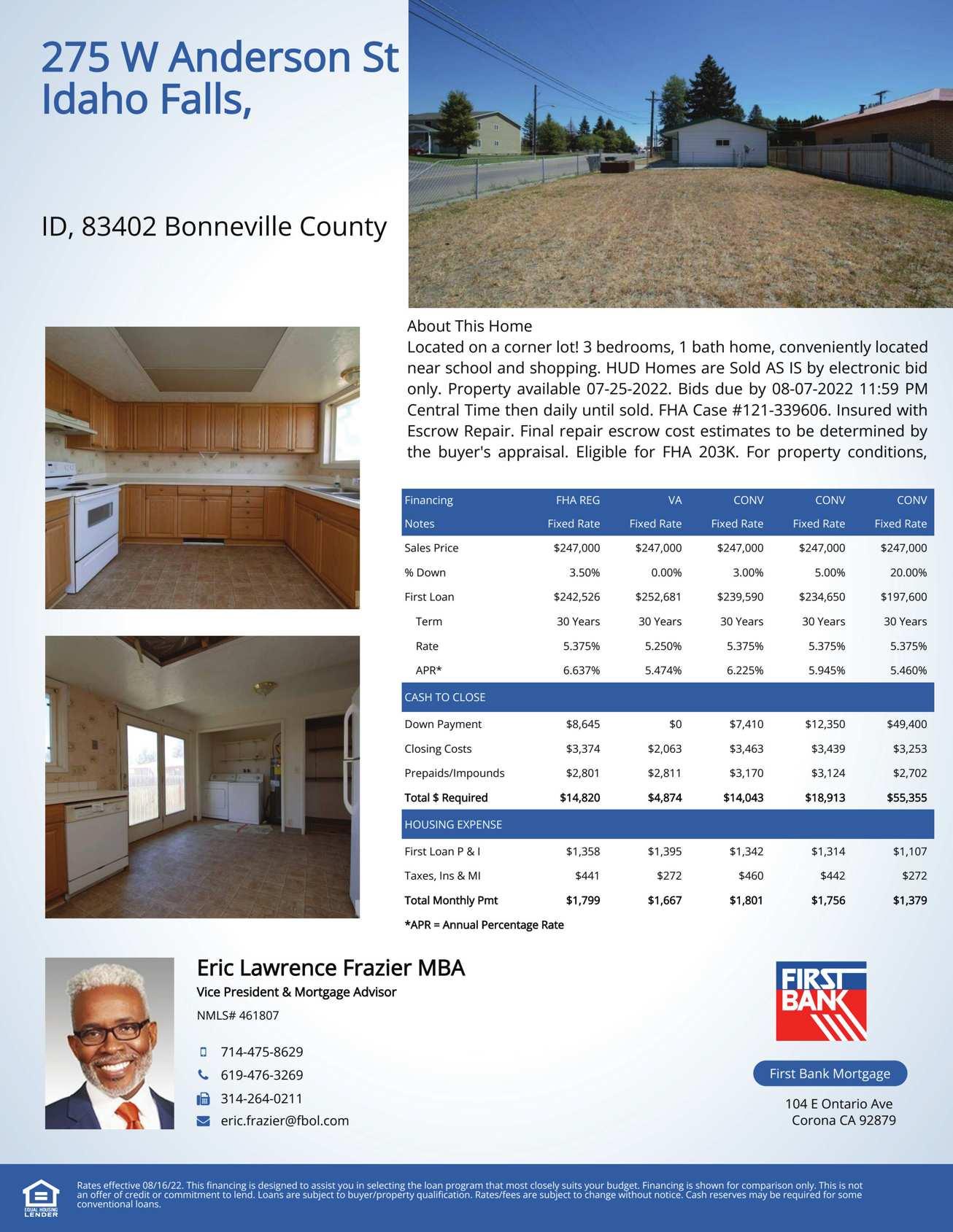 BEDROOMS BATHROOMS SQ. FT PROPERTY ADDRESS 4 2 1,502 2119 N 9th Ave Pasco, Franklin County OFFER PRICE: $295,000 PROPERTY GALLERY single family home YEAR BUILT: 1957 TOTAL ROOMS: 9 for more information about this property or to make an offer to purchase please contact a VIP Agent by clicking here: https://www.thepowerisnow.com/vipagent/ or call 800-261-1634 ext 707 ERIC L. FRAZIER NMLS ID: 461807 PHONE: (800) 261-1634 EXT: 703 EMAIL: ERIC.FRAZIER@THEPOWERISNOW.COM PROPERTY CASE NO: 562-288378