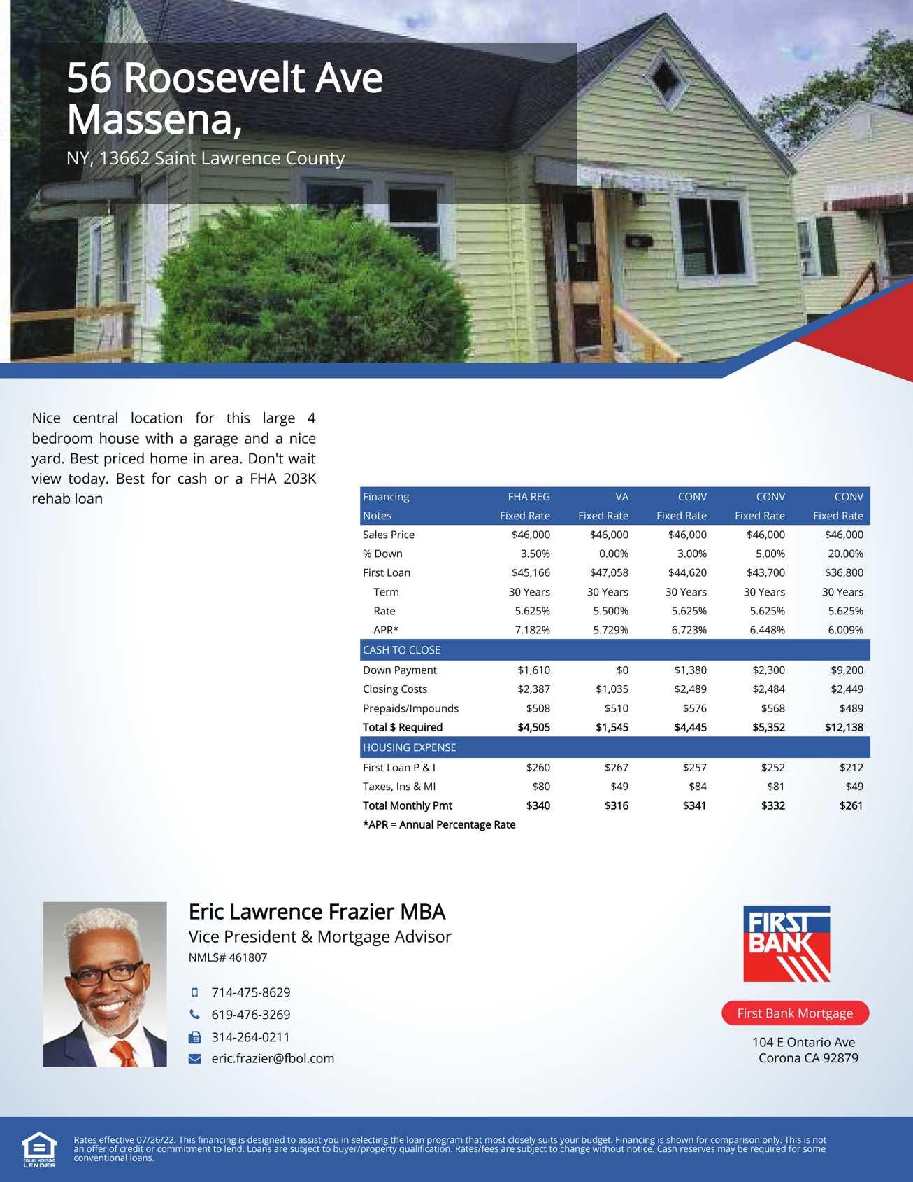 BEDROOMS BATHROOMS SQ. FT PROPERTY ADDRESS 4 1 1,312 56 Roosevelt Ave Massena, Saint Lawrence County OFFER PRICE: $46,000 PROPERTY GALLERY single family home YEAR BUILT: 1942 TOTAL ROOMS: 6 for more information about this property or to make an offer to purchase please contact a VIP Agent by clicking here: https://www.thepowerisnow.com/vipagent/ or call 800-261-1634 ext 707 ERIC L. FRAZIER NMLS ID: 461807 PHONE: (800) 261-1634 EXT: 703 EMAIL: ERIC.FRAZIER@THEPOWERISNOW.COM PROPERTY CASE NO: 371-310805