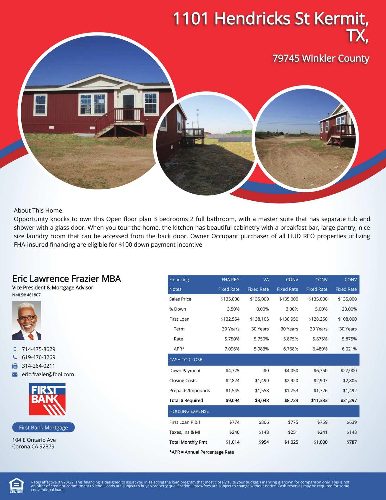 BEDROOMS BATHROOMS SQ. FT PROPERTY ADDRESS 3 2 1,301 1101 Hendricks St Kermit, TX, Winkler County OFFER PRICE: $135,000 PROPERTY GALLERY single family home YEAR BUILT: 2017 TOTAL ROOMS: 5 for more information about this property or to make an offer to purchase please contact a VIP Agent by clicking here: https://www.thepowerisnow.com/vipagent/ or call 800-261-1634 ext 707 ERIC L. FRAZIER NMLS ID: 461807 PHONE: (800) 261-1634 EXT: 703 EMAIL: ERIC.FRAZIER@THEPOWERISNOW.COM PROPERTY CASE NO: 494-450458