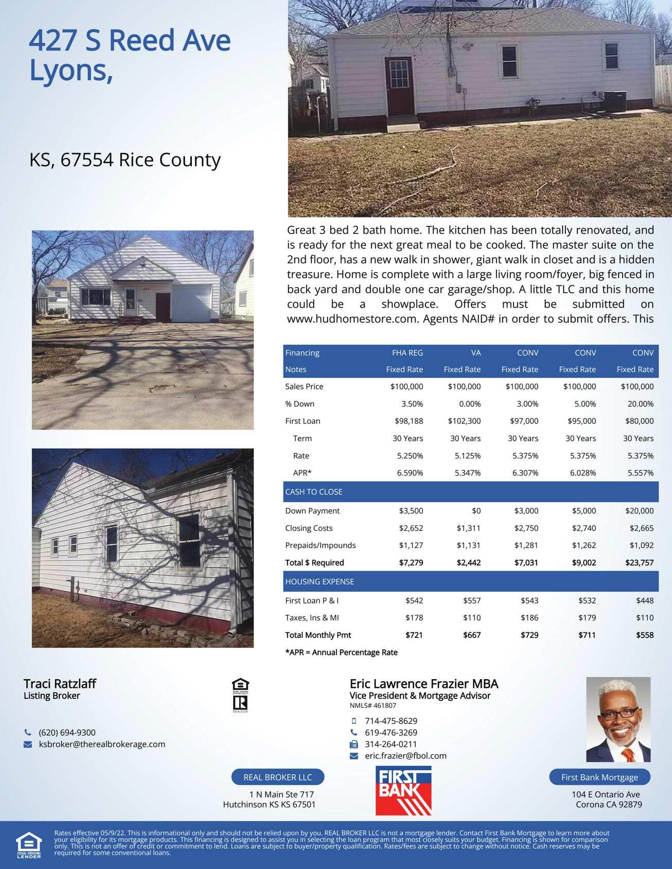 BEDROOMS BATHROOMS SQ. FT PROPERTY ADDRESS 4 2 3,218 129 S Broadway Hobart, Kiowa County OFFER PRICE: $78,570 PROPERTY GALLERY single-family home YEAR BUILT: 1930 TOTAL ROOMS: 9 for more information about this property or to make an offer to purchase please contact a VIP Agent by clicking here: https://www.thepowerisnow.com/vipagent/ or call 800-261-1634 ext 707 ERIC L. FRAZIER NMLS ID: 461807 PHONE: (800) 261-1634 EXT: 703 EMAIL: ERIC.FRAZIER@THEPOWERISNOW.COM PROPERTY CASE NO: 421-574607