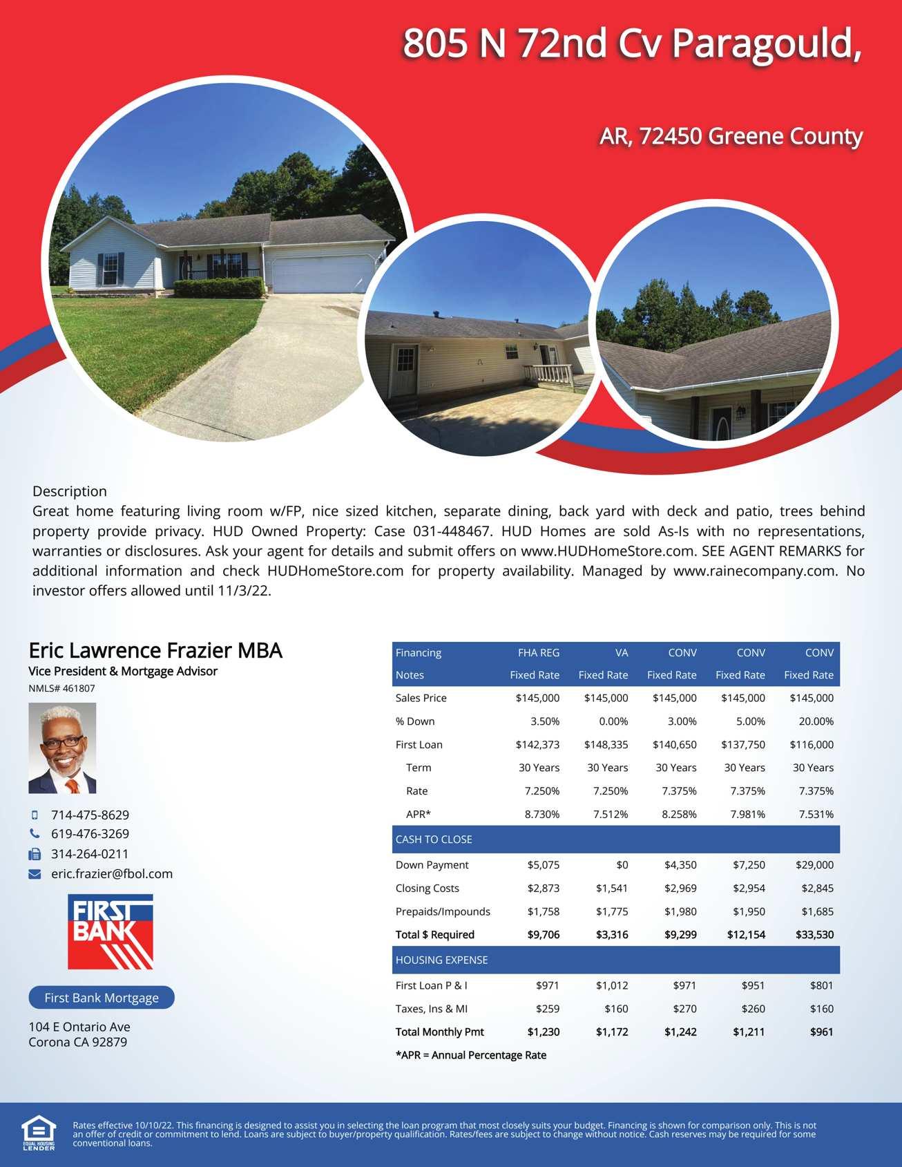 BEDROOMS BATHROOMS SQ. FT PROPERTY ADDRESS 3 2 1,458 805 N 72nd Cv Paragould, Greene County OFFER PRICE: $145,000 PROPERTY GALLERY SINGLE FAMILY HOME YEAR BUILT: 1999 TOTAL ROOMS: 6 for more information about this property or to make an offer to purchase please contact a VIP Agent by clicking here https://www.thepowerisnow.com/vipagent/ or call 800-261-1634 ext 707 ERIC L. FRAZIER NMLS ID: 461807 PHONE: (800) 261-1634 EXT: 703 EMAIL: ERIC.FRAZIER@THEPOWERISNOW.COM PROPERTY CASE NO: 031-448467