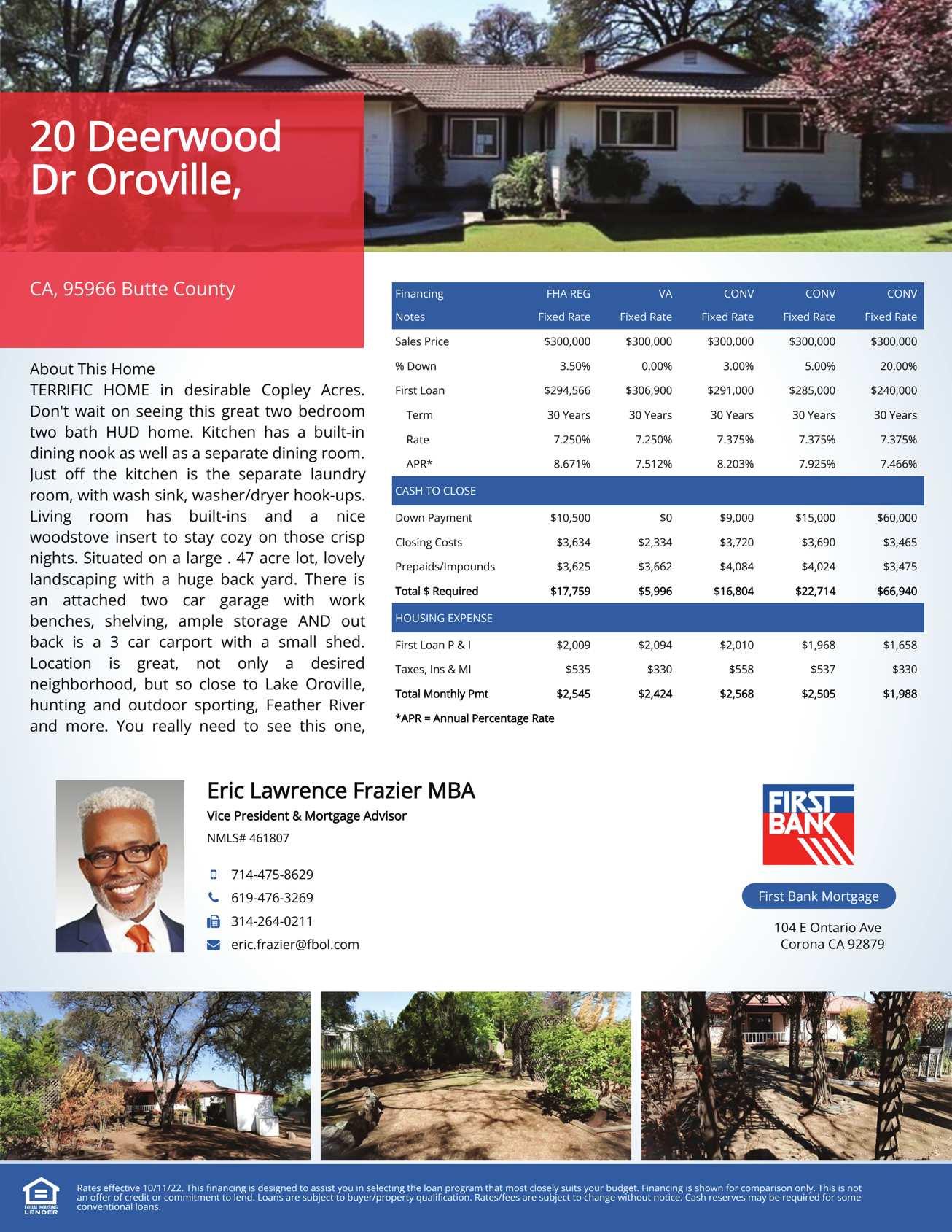 BEDROOMS BATHROOMS SQ. FT PROPERTY ADDRESS 2 1 1,406 20 Deerwood Dr Oroville, Butte County OFFER PRICE: $300,000 PROPERTY GALLERY single family home YEAR BUILT: 1977 TOTAL ROOMS: 5 ERIC L. FRAZIER NMLS ID: 461807 PHONE: (800) 261-1634 EXT: 703 EMAIL: ERIC.FRAZIER@THEPOWERISNOW.COM PROPERTY CASE NO: 043-743273 for more information about this property or to make an offer to purchase please contact a VIP Agent by clicking here https://www.thepowerisnow.com/vipagent/ or call 800-261-1634 ext 707