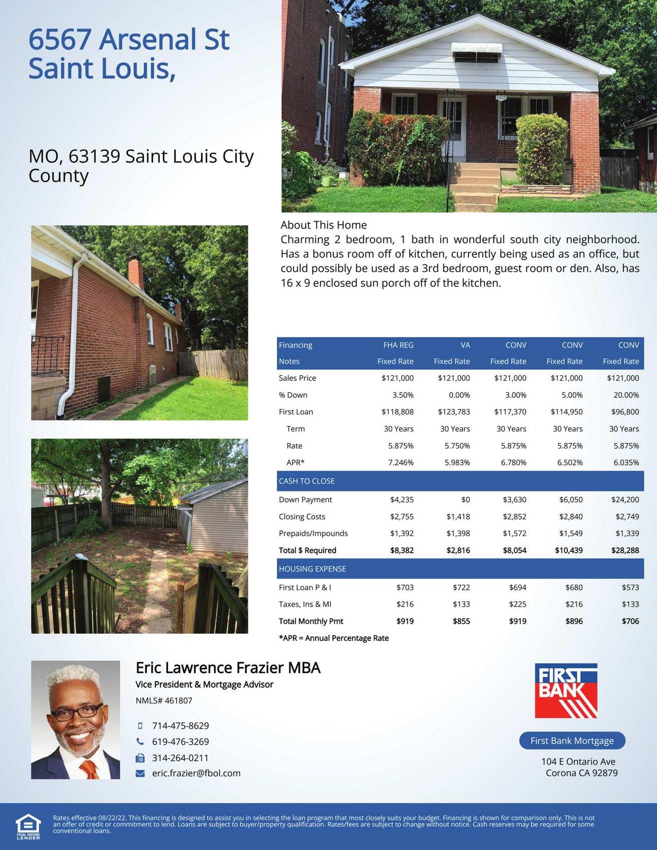 BEDROOMS BATHROOMS SQ. FT PROPERTY ADDRESS 2 1 1,008 6567 Arsenal St Saint Louis, Saint Louis City County OFFER PRICE: $121,000 PROPERTY GALLERY single family home YEAR BUILT: 1920 TOTAL ROOMS: 7 ERIC L. FRAZIER NMLS ID: 461807 PHONE: (800) 261-1634 EXT: 703 EMAIL: ERIC.FRAZIER@THEPOWERISNOW.COM PROPERTY CASE NO: 292-727690 for more information about this property or to make an offer to purchase please contact a VIP Agent by clicking here https://www.thepowerisnow.com/vipagent/ or call 800-261-1634 ext 707