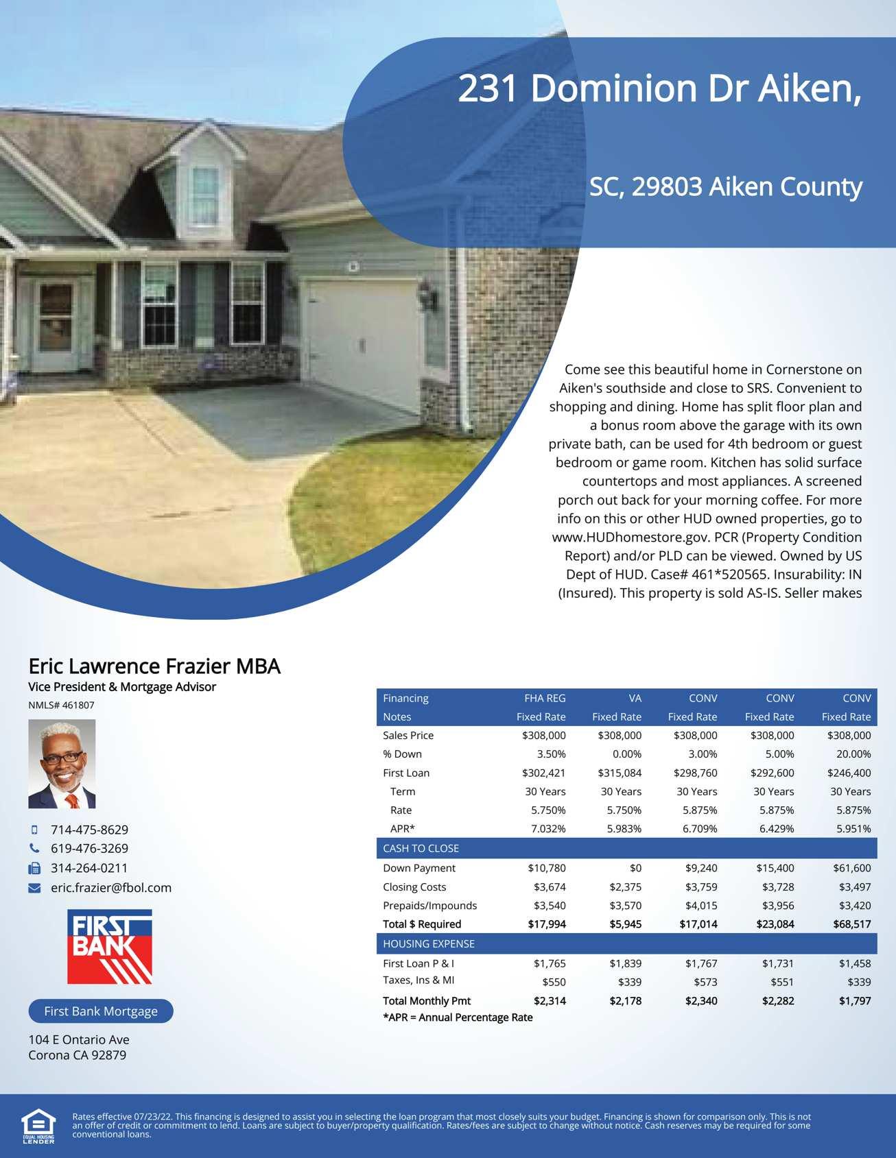 BEDROOMS BATHROOMS SQ. FT PROPERTY ADDRESS 3 3 2,321 231 Dominion Dr Aiken, SC, 29803 Aiken County OFFER PRICE: $308,000 PROPERTY GALLERY single family home YEAR BUILT: 2010 TOTAL ROOMS: 7 for more information about this property or to make an offer to purchase please contact a VIP Agent by clicking here: https://www.thepowerisnow.com/vipagent/ or call 800-261-1634 ext 707 ERIC L. FRAZIER NMLS ID: 461807 PHONE: (800) 261-1634 EXT: 703 EMAIL: ERIC.FRAZIER@THEPOWERISNOW.COM PROPERTY CASE NO: 461-520565