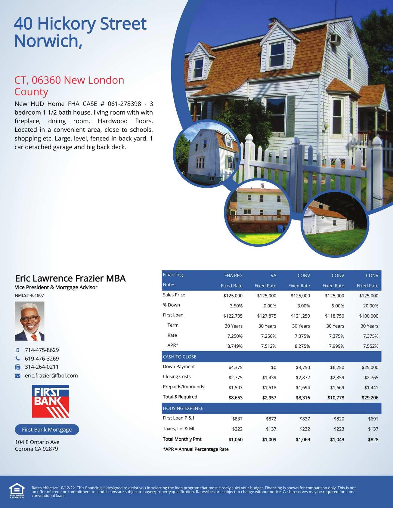 BEDROOMS BATHROOMS SQ. FT PROPERTY ADDRESS 3 1 1,335 12 Little Pine Plac Franklin, Venango County OFFER PRICE: $83,000 PROPERTY GALLERY single family home YEAR BUILT: 1950 TOTAL ROOMS: 7 for more information about this property or to make an offer to purchase please contact a VIP Agent by clicking here: https://www.thepowerisnow.com/vipagent/ or call 800-261-1634 ext 707 ERIC L. FRAZIER NMLS ID: 461807 PHONE: (800) 261-1634 EXT: 703 EMAIL: ERIC.FRAZIER@THEPOWERISNOW.COM PROPERTY CASE NO: 442-328554