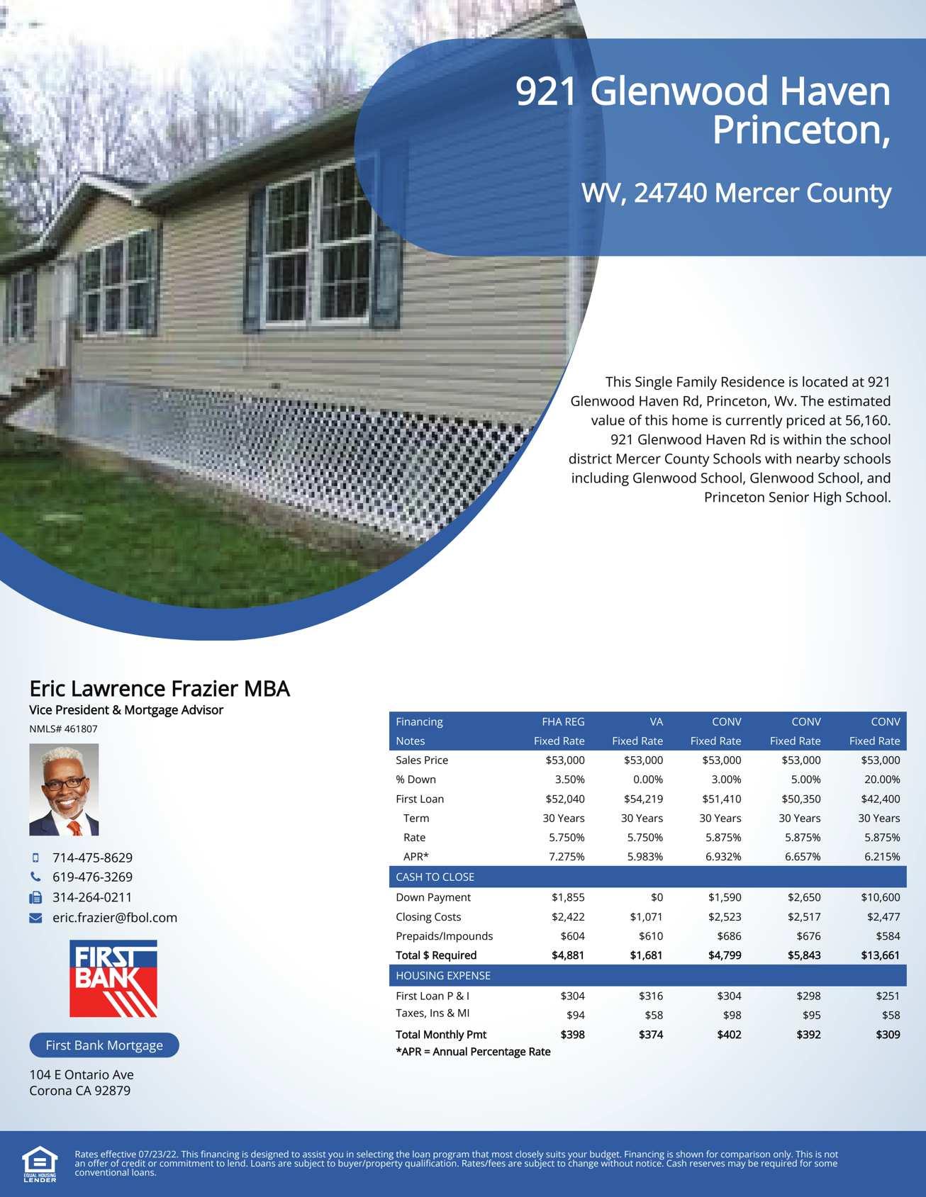 BEDROOMS BATHROOMS SQ. FT PROPERTY ADDRESS 3 2 1,528 921 Glenwood Haven Princeton, Mercer County OFFER PRICE: $53,000 PROPERTY GALLERY Manufactured Home YEAR BUILT: 2006 TOTAL ROOMS: 6 for more information about this property or to make an offer to purchase please contact a VIP Agent by clicking here: https://www.thepowerisnow.com/vipagent/ or call 800-261-1634 ext 707 ERIC L. FRAZIER NMLS ID: 461807 PHONE: (800) 261-1634 EXT: 703 EMAIL: ERIC.FRAZIER@THEPOWERISNOW.COM PROPERTY CASE NO: 571-088980