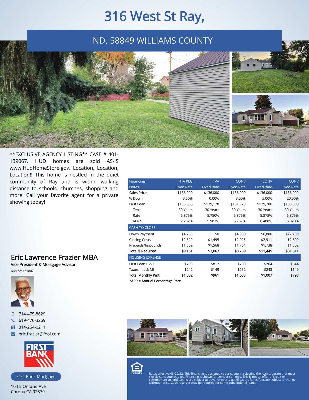 BEDROOMS BATHROOMS SQ. FT PROPERTY ADDRESS 2 1 816 316 West St Ray, Williams County OFFER PRICE: $171,000 PROPERTY GALLERY single family home YEAR BUILT: 1954 TOTAL ROOMS: 5 for more information about this property or to make an offer to purchase please contact a VIP Agent by clicking here: https://www.thepowerisnow.com/vipagent/ or call 800-261-1634 ext 707 ERIC L. FRAZIER NMLS ID: 461807 PHONE: (800) 261-1634 EXT: 703 EMAIL: ERIC.FRAZIER@THEPOWERISNOW.COM PROPERTY CASE NO: 401-139067