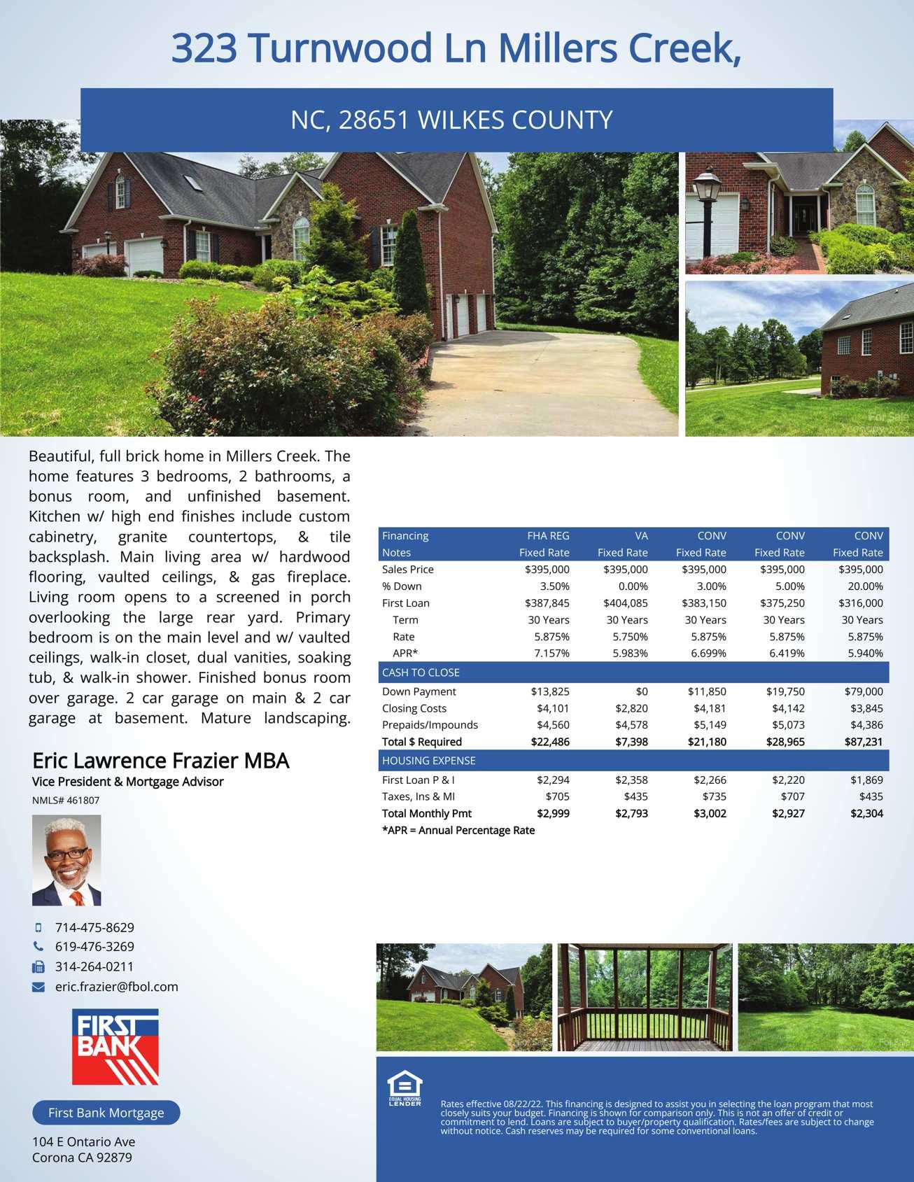 BEDROOMS BATHROOMS SQ. FT PROPERTY ADDRESS 3 2 2,234 323 Turnwood Ln Millers Creek, Wilkes County OFFER PRICE: $395,000 PROPERTY GALLERY single family home YEAR BUILT: 2004 TOTAL ROOMS: 8 for more information about this property or to make an offer to purchase please contact a VIP Agent by clicking here: https://www.thepowerisnow.com/vipagent/ or call 800-261-1634 ext 707 ERIC L. FRAZIER NMLS ID: 461807 PHONE: (800) 261-1634 EXT: 703 EMAIL: ERIC.FRAZIER@THEPOWERISNOW.COM PROPERTY CASE NO: 387-051887