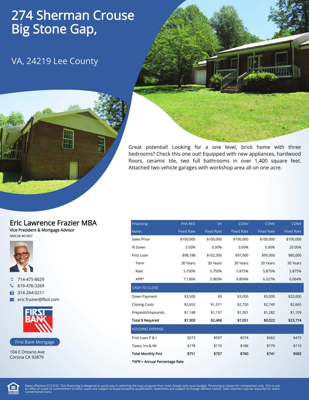 BEDROOMS BATHROOMS SQ. FT PROPERTY ADDRESS 3 2 1,473 274 Sherman Crouse Big Stone Gap, Lee County OFFER PRICE: $100,000 PROPERTY GALLERY single family home YEAR BUILT: 1977 TOTAL ROOMS: 6 for more information about this property or to make an offer to purchase please contact a VIP Agent by clicking here: https://www.thepowerisnow.com/vipagent/ or call 800-261-1634 ext 707 ERIC L. FRAZIER NMLS ID: 461807 PHONE: (800) 261-1634 EXT: 703 EMAIL: ERIC.FRAZIER@THEPOWERISNOW.COM PROPERTY CASE NO: 541-808185