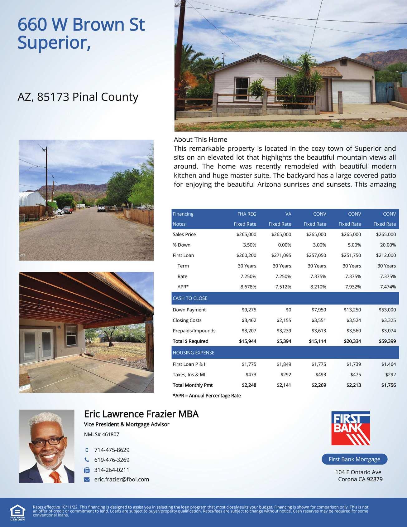 BEDROOMS BATHROOMS SQ. FT PROPERTY ADDRESS 2 2 1,494 660 W Brown St Superior, Pinal County OFFER PRICE: $265,000 PROPERTY GALLERY SINGLE FAMILY HOME YEAR BUILT: 1961 TOTAL ROOMS: 6 for more information about this property or to make an offer to purchase please contact a VIP Agent by clicking here https://www.thepowerisnow.com/vipagent/ or call 800-261-1634 ext 707 ERIC L. FRAZIER NMLS ID: 461807 PHONE: (800) 261-1634 EXT: 703 EMAIL: ERIC.FRAZIER@THEPOWERISNOW.COM PROPERTY CASE NO: 023-899794