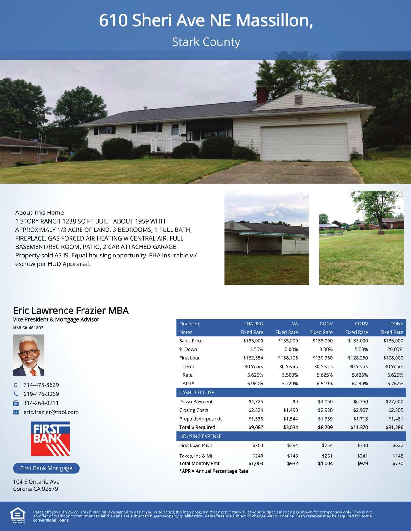 BEDROOMS BATHROOMS SQ. FT PROPERTY ADDRESS 3 1 1,362 610 Sheri Ave NE Massillon, Stark County OFFER PRICE: $135,000 PROPERTY GALLERY single family home YEAR BUILT: 1959 TOTAL ROOMS: 6 for more information about this property or to make an offer to purchase please contact a VIP Agent by clicking here: https://www.thepowerisnow.com/vipagent/ or call 800-261-1634 ext 707 ERIC L. FRAZIER NMLS ID: 461807 PHONE: (800) 261-1634 EXT: 703 EMAIL: ERIC.FRAZIER@THEPOWERISNOW.COM PROPERTY CASE NO: 412-535456