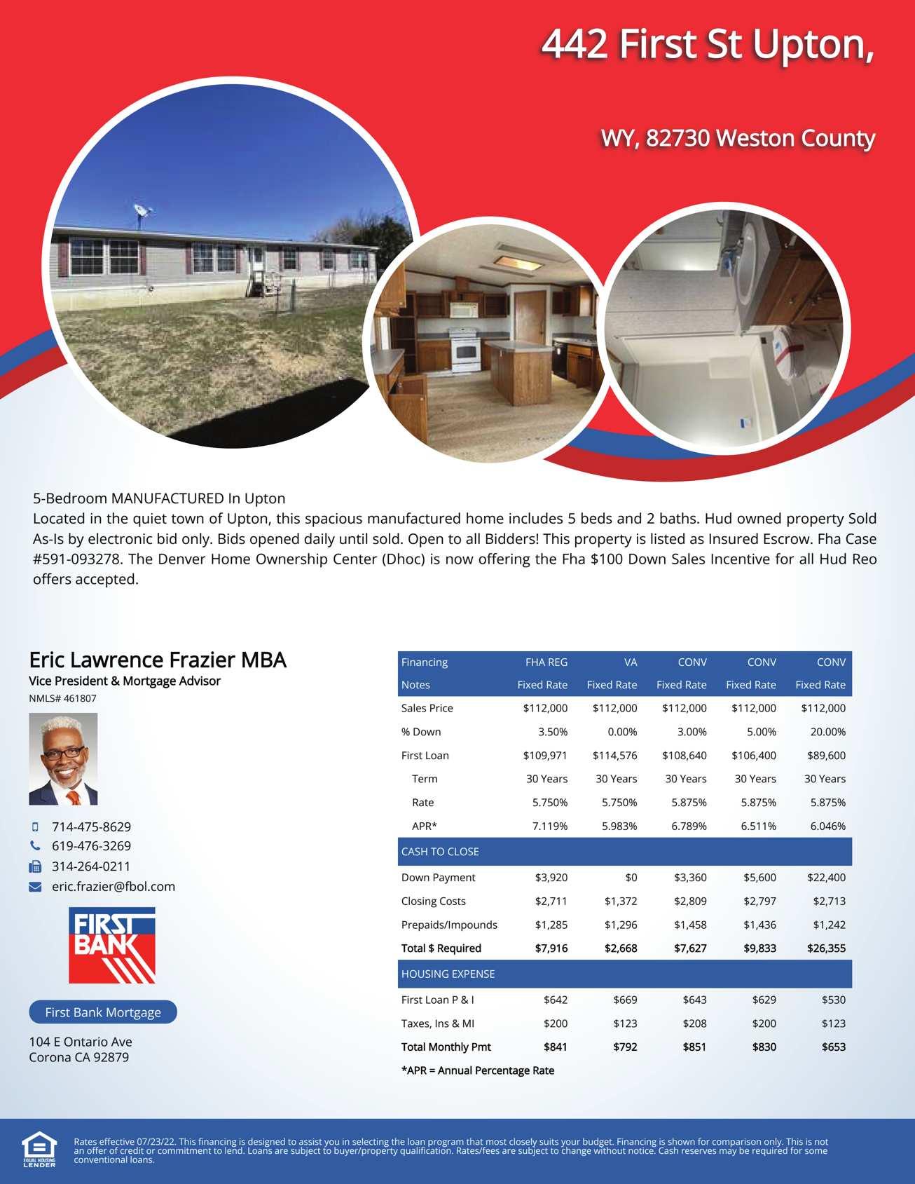 BEDROOMS BATHROOMS SQ. FT PROPERTY ADDRESS 4 2 2,375 442 First St Upton, Weston County OFFER PRICE: $112,000 PROPERTY GALLERY manufactured home YEAR BUILT: 2003 TOTAL ROOMS: 9 for more information about this property or to make an offer to purchase please contact a VIP Agent by clicking here: https://www.thepowerisnow.com/vipagent/ or call 800-261-1634 ext 707 ERIC L. FRAZIER NMLS ID: 461807 PHONE: (800) 261-1634 EXT: 703 EMAIL: ERIC.FRAZIER@THEPOWERISNOW.COM PROPERTY CASE NO: 591-093278