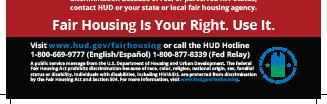 Choosing where you live is a right. Housing discrimination is wrong. Discrimination because of race, color, religion or national origin is illegal. The only way to stop it is for you to report it. Fair Housing Is Your Right. Use It. Visit www.hud.gov/fairhousing or call the HUD Hotline 1-800-669-9777 (English/EspaƱol) 1-800-927-9275 (TTY) SCAN HERE FOR MORE INFO A public service message from the U.S. Department of Housing and Urban Development in partnership with the National Fair Housing Alliance. The federal Fair Housing Act prohibits discrimination because of race, color, religion, national origin, sex, familial status or disability. For more information, visit www.hud.gov/fairhousing.
