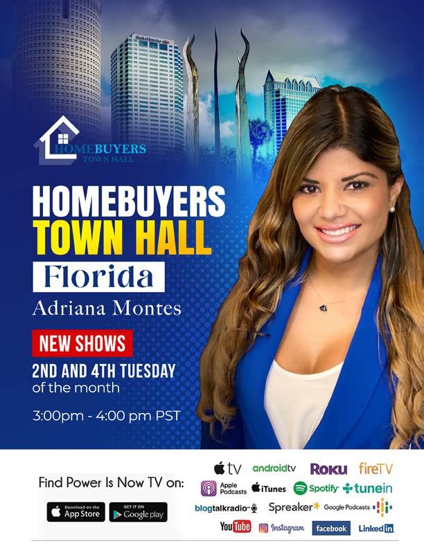 CONTENT TELEVISION GUIDE Did you know you can watch your favorite Power Is Now TV show on the go on your mobile device? Download our mobile app on Google Store or Apple store today! 30 Mortgage Spotlight & Affordable Housing Series 46 34 12 Real Estate Roundtable- Sharon Bartlette Fair Housing Series -Eric Frazier Homebuyer Town hall- Joe Fisher 75 Home Buyer Townhall Payson, AZ hosted by Tamra Lee Ulmer 78 The Business of Real EstateEmerick A. Peace 80 Home Buyer Townhall Anoka County, MN hosted by Francine Marsolek 18 Eric Frazier Show 40 Home Buyer Townhall Orlando, Fl hosted by Adriana Montes 53 Home Buyer Townhall Corona, CA hosted by Jenny Gonzalez 60 66 70 Home Buyer Townhall Silicon Valley, CA hosted by Ian Batra Home Buyer Townhall Elk Grove, CA hosted by John Costigan Home Buyer Townhall Sacramento, CA hosted by Serina Lowden 86 Home Buyer Townhall Scottsdale, AZ hosted by Yvonne “Jett” McFadden 90 Home Buyer Townhall New Haven, CT hosted by Steve Rivkin