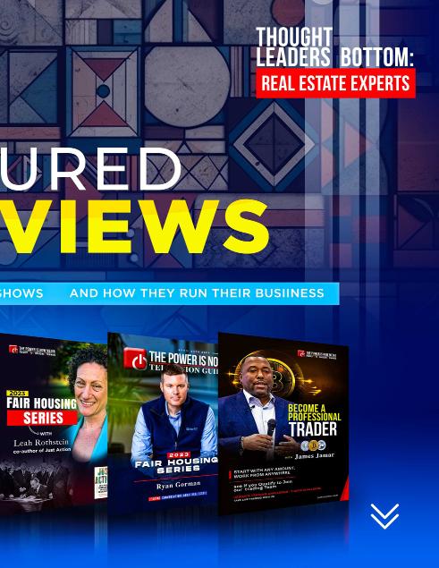 FEATURED INTERVIEWS 6 SUCCESS REALTY 39 GSFA TV 40 NRBA TV 48 Homeownership Series 50 JOE FISHHER TV SHOW 54 THE ERIC FRAZIER SHOW 58 MORTGAGE SPORTLIGTH 62 AFFORDABLE HOUSING SERIES 62 POWER AGENT SPOTLIGHT 66 2023 FAIR HOUSING SERIES 70 THE REAL ESTATE RåOUNTABLE 76 WITH ERIC FRAZIER 76 ADRIANA MONTES 86 REAL ESTATE SHOW 86 DASHUNDA MORRIS REAL ESTATE SHOW 94 REAL ESTATE ROUNDTABLE 100 WITH SHARON BARTLETT 100 REAL ESTATE SEMINAR 102 WITH ERIC FRAZIER 102 WALTERHUFF REAL ESTATE SHOW 110 HOME BUYERS TOWN HALL 117 RIVERSIDE WITH RUBY FRAZIER 117 TWIN CIITY REAL ESTATE SHOW 122 REAL ESTATE MARKET UPDATE 129 WITH YVONNE MCFADDEN 129 Frazier Group Realty 134 STEVEN RIVKIN 138 NEW HAVEN CONNECTICUT 138 MY PHENOMENAL WORLD 142
