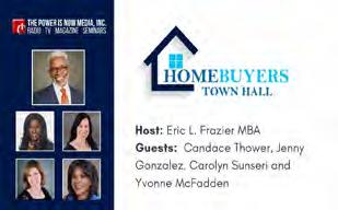 GUIDE Did you know you can watch your favorite Power Is Now TV show on the go on your mobile device? Download our mobile app on Google Store or Apple store today! 16 Mortgage Spotlight & Affordable Housing Series 28 Real Estate Roundtable- Sharon Bartlette 58 Home Buyer Townhall Payson, AZ hosted by Tamra Lee Ulmer 78 The Business of Real EstateEmerick A. Peace 62 Home Buyer Townhall Anoka County, MN hosted by Francine Marsolek 19 Fair Housing Series - Eric l. Frazier 23 Home Buyer Townhall Orlando, Fl hosted by Adriana Montes 35 Home Buyer Townhall Corona, CA hosted by Jenny Gonzalez 42 48 52 Home Buyer Townhall Silicon Valley, CA hosted by Ian Batra Home Buyer Townhall Elk Grove, CA hosted by John Costigan Home Buyer Townhall Sacramento, CA hosted by Serina Lowden 66 Home Buyer Townhall Scottsdale, AZ hosted by Yvonne “Jett” McFadden 72 Home Buyer Townhall New Haven, CT hosted by Steve Rivkin