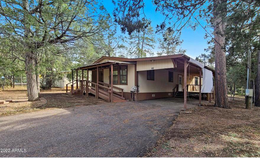 This wonderful 2 bedroom 2 bathroom home has many nice appointments throughout. There is a Den or potential 3rd bedroom off of the Large Living room. Kitchen has lots of cabinet space with Island bar and good counter space. Separate Laundry room and spacious bedrooms make this home perfect for full or part time living. The exterior includes a covered carport, shed and two nice covered decks to enjoy the fresh mountain air of Payson Arizona. Hud Stickers are present. The property has a very nice sized yard with tall pines and so much more. Take a look at this one today!